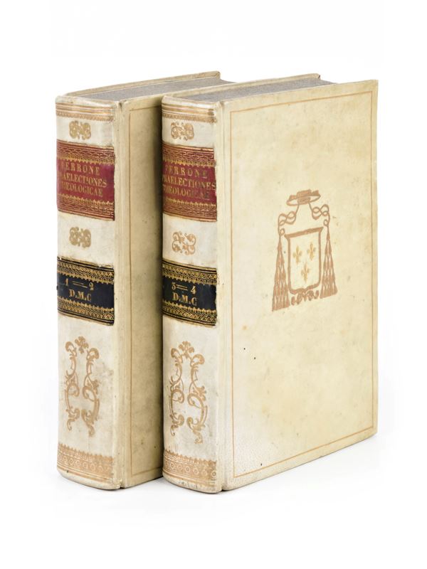 [Binding of arms] Perrone, Joannes : Praelectiones Theologicae quas habebat in Collegio Romano Joannes Perrone e Societate Jesu ab eodem in compendium redactae. Neapoli, 1845. Complete, 4 parts in 2 volumes.