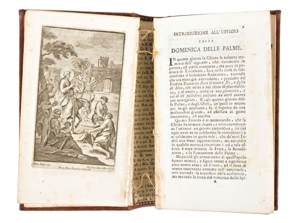 - Holy Week Office with the Italian version by Monsi. Martini... And with the vernacular rubrics, Topics of the Psalms ... by Abbot Alessandro Mazzinelli Rome, Perego Salvioni, 1823. In-12ยฐ, mm. 170x110, pp. (2), XII, 594, 1 c. of plates. Missing the last leaf Bb10. Detached front hinge, with the first 8 leaves partially detached. Blue ink stains in the text on leaves I2, I3 and on the back of leaf Aa12 (small stain at the edge). Title page printed in red and black. Text arranged in two columns with the Latin and Italian versions facing each other. 1 copperplate depicting the entry of Jesus into Jerusalem by Antonio Nessi and Alessio Giardoni.