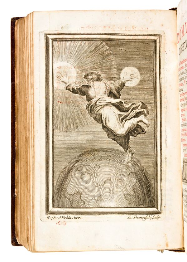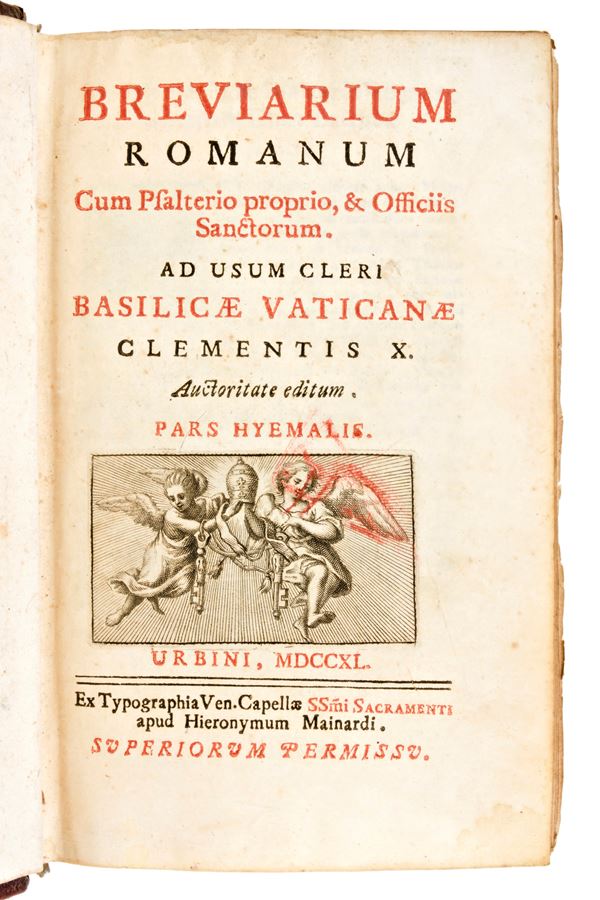 - Breviarium Romanum cum Psalterio proper, & Officiis Sanctorum. Ad usum cleri Basilicae Vaticanae Clementis 10. Auctoritate editum. Pars hiemalis (Volume 1 of 4, Winter Part only). Urbini, Ex Typographia Ven. Capellae SSmi Sacramenti : apud Hieronymum Mainardi, 1740. In-8, mm. 185x125, pp. (40), 764, ccxliv. Complete. Clear text, printed in red and black in two columns, with some intaglio figures outside the text. Small flaw on the cap, slight peeling on the plates and spine. Minimal signs of aging. Title page in red and black with papal coat of arms engraved in copperplate.