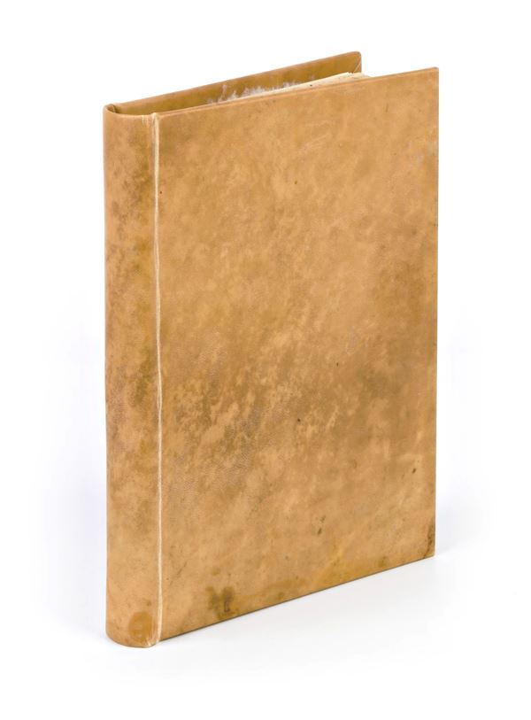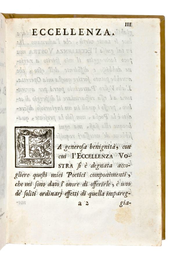 The Three Julys or Sonnets of Niceste Abideno PA on the importunity of a creditor of three Julys... In Rome, Bernabò & Lazzarini 1762. Rare first edition printed in Rome in 1762. Engraving vignette on the front with the emblem of the Accademia degli Arcadi (motto: Gli Arcadi), woodcut initials and decorations. Post-muted binding in full parchment. In-4°, pp. XVIII, 200, (2).