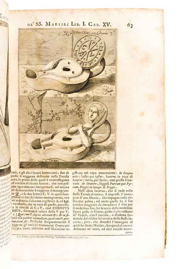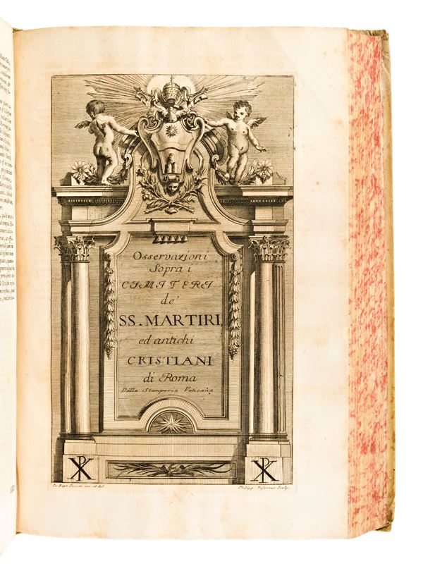 Large in-4° format, mm. 360x255, pp. (16), 326 / (2), 327-650, 651-808. Contemporary full parchment binding with 6 ribs, gold titles on the spine. Marbled edges of the leaves. With defects and losses on the spine (small wormholes), light browning and sporadic foxing. Old ink note on the front flyleaf. With 2 copperplate frontispieces (Puccetti inv. & Philipp: Vascorius Sculp.), 2 frontispieces printed in black and red with woodcut vignette, copperplate initials, copperplate headpieces and tailpieces and woodcut initials; speaking copperplate initial signed “Brughi inv.” on paper π3r; copperplate headpiece signed “Romae Typis Io: M.ae Salvioni | I. Freij Sc.” on A1r paper; numerous chalcographic and woodcut illustrations within the text; text in two columns; roman, italic.