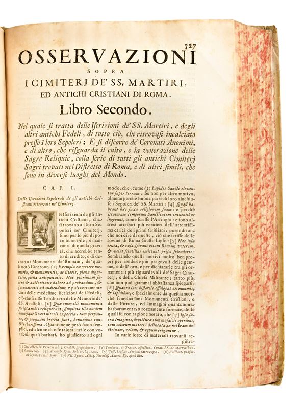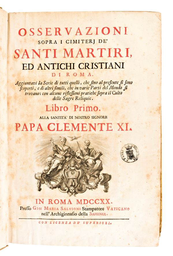 Observations on the cemeteries of the holy martyrs and ancient Christians of Rome. Added to this is a series of all those which have been discovered up to the present time; and of other similar ones which are found in various parts of the world: with some practical reflections on the Cult of Sacred Relics. Book One-Third, to the Holiness of Our Lord Pope Clement XI. In Rome, at Gio. Maria Salvioni, Vatican Printer, in the Archiginnasio della Sapienza, 1720. Work of the theologian Marcantonio Boldetti (1663-1749). Bonaventura was confirmed in the office of secret almoner (to which he had been called by Pope Pignatelli in 1691), and having become canon of S. Maria in Trastevere, he was nominated by the new pontiff Clement XI as custodian of the relics and cemeteries.
