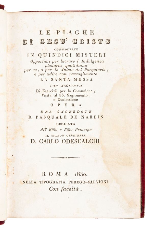 - De Nardis, Pasquale: The wounds of Jesus Christ considered in fifteen appropriate mysteries... Rome, Tip. Perego-Salvioni, 1830. (In-8°, mm. 175x120, pp. XVI, 160) Internal margins poorly applied from p. 16 to p. 33, with tiny losses of text.