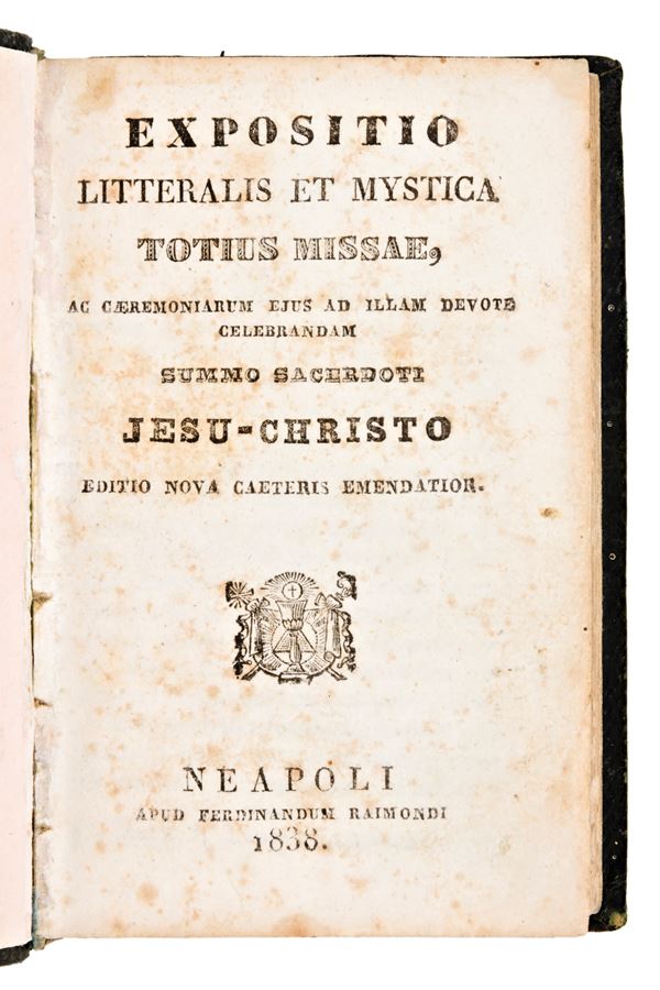 - Expositio litteralis et mystica totius missae,... Naples, F. Raimondi 1838. (In-8°, mm. 110x75, pp. 236) Specimens in good condition with slight foxing and minimal signs of aging. There is an ancient period color holy card of S. Matthaeus the Evangelist and a b/w holy card depicting Jesus on the cross (20th century).