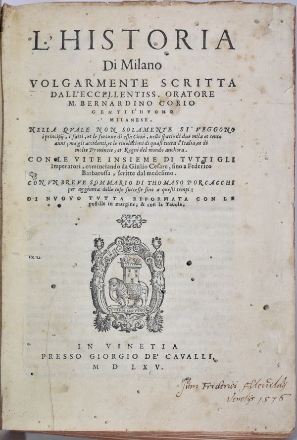 Corio, Bernardino: THE HISTORY OF MILAN. vulgarly written, in which are seen not only the origin, the facts, and the fortunes of the city, in the space of two thousand and one hundred years... again completely reformed with marginal notes and with the table. In Venice, 1565, at Giorgio De' Cavalli.