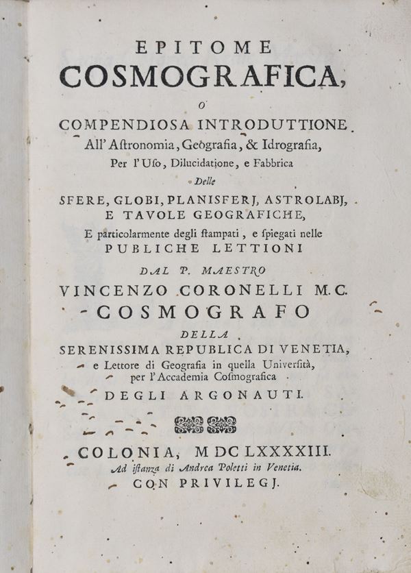 Coronelli, Vincenzo: COSMOGRAPHICAL EPITOME, OR COMPENDIOUS INTRODUCTION TO ASTRONOMY, GEOGRAPHY, & HYDROGRAPHY, FOR THE USE, DILUCATION, AND MANUFACTURE OF SPHERES, GLOBES, PLANISPHERES, ASTROLABS, AND GEOGRAPHICAL TABLES, AND PARTICULARLY OF THE PRINTED MATERIALS, AND EXPLAINED IN PUBLIC LECTURES … Cologne [ie Venice], 1693, at the request of Andrea Poletti in Venice.