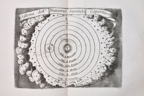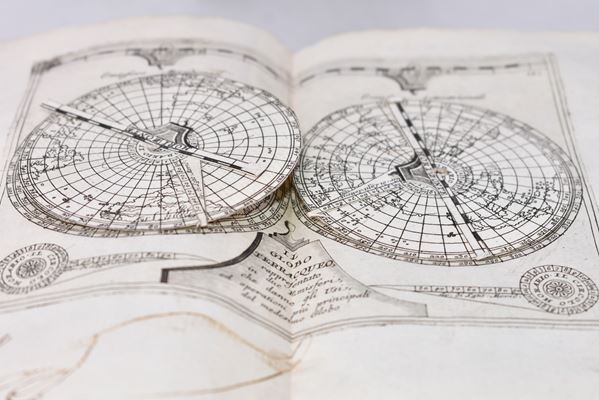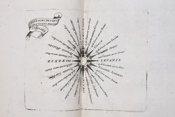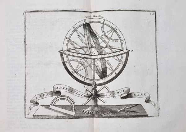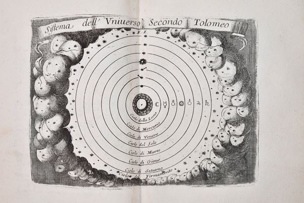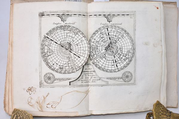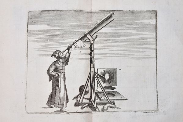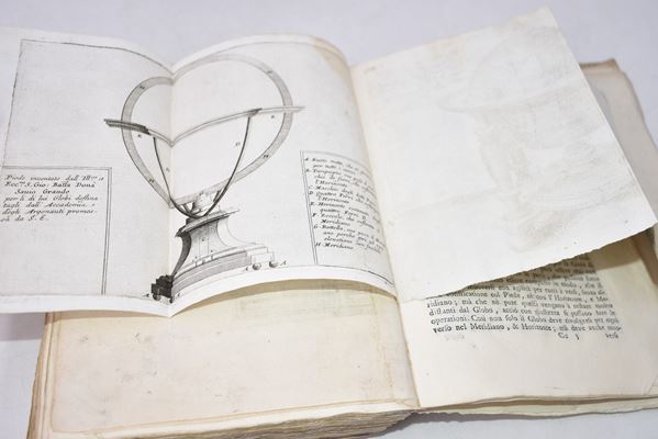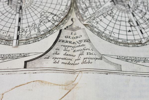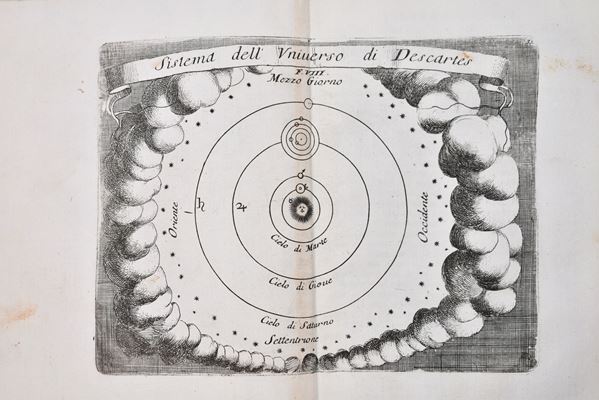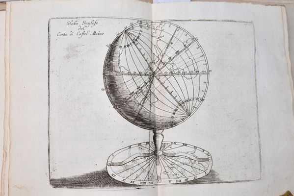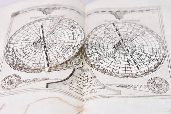 Rare first edition of the work that represents the first attempt to condense into a relatively few pages what had been published up to that time on astronomy and geography, practically the prototype of modern manuals of physical, natural and political geography. With 2 frontispieces, one of which is illustrated; like other known copies, this one is also missing some plates; however, the double-page plate with 6 movable parts is preserved. Fresh copy, with slight stains on the last 4 plates, binding with loose internal hinges; on the inside cover, ex-libris handwritten by Leonardo Trissino dated 7 Apr. 1838.