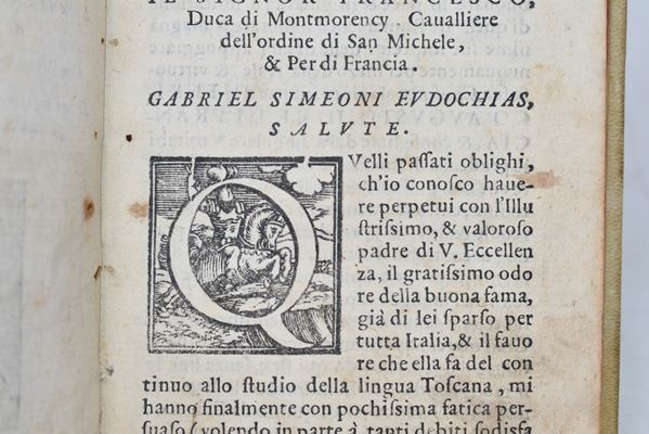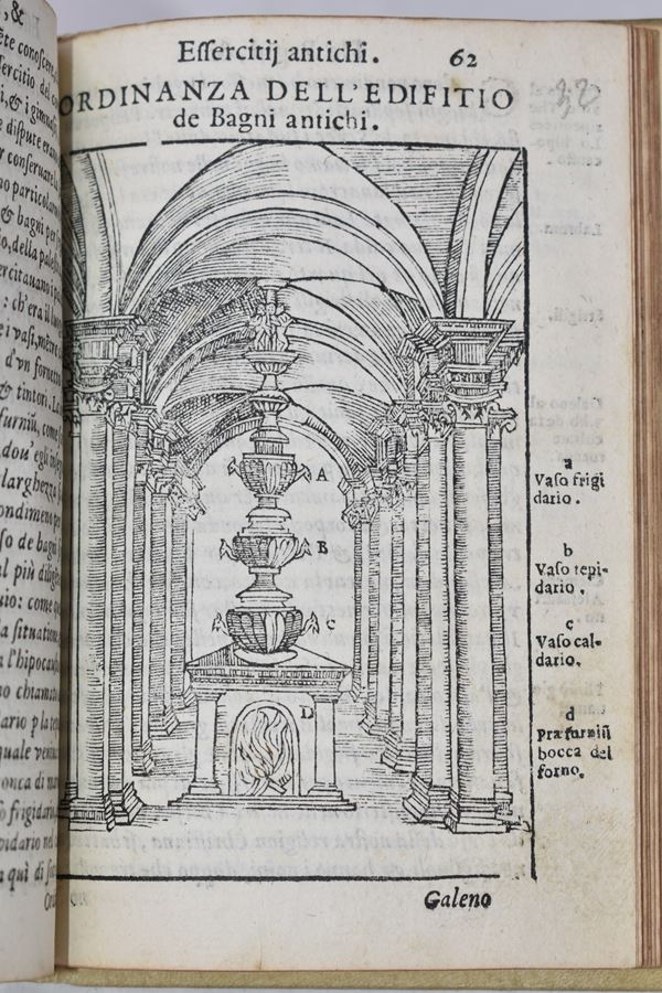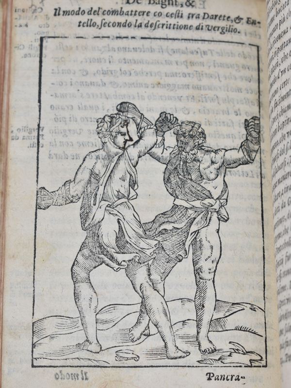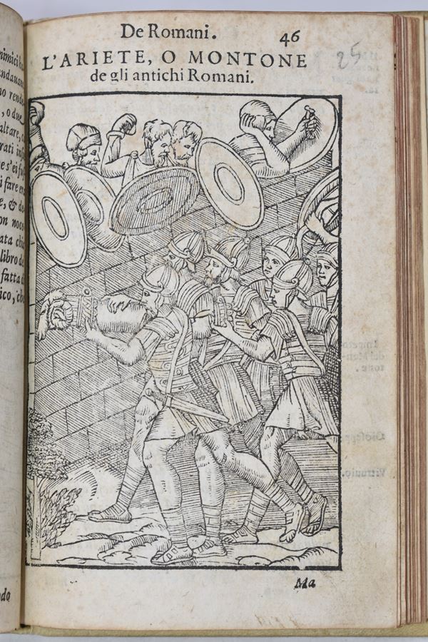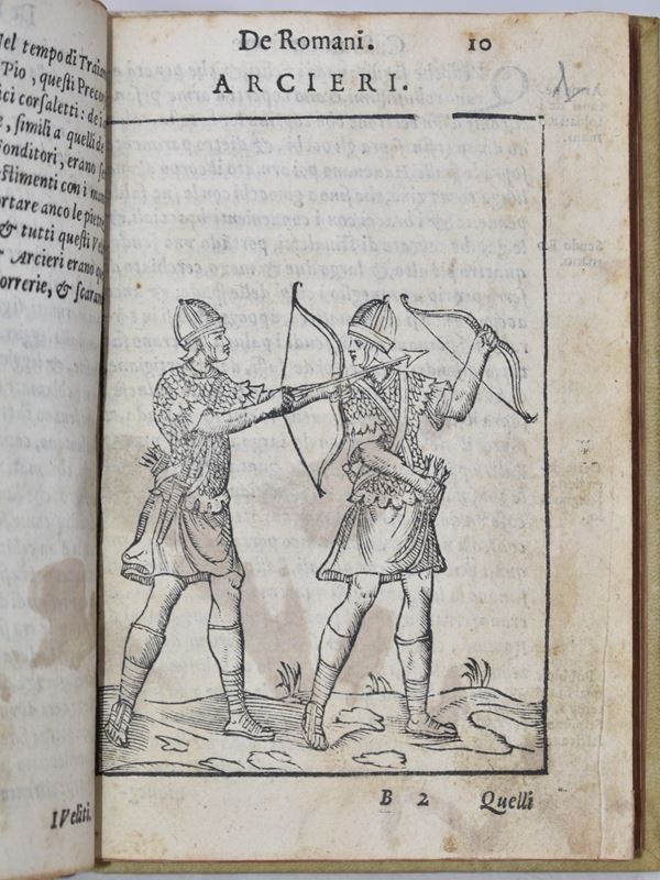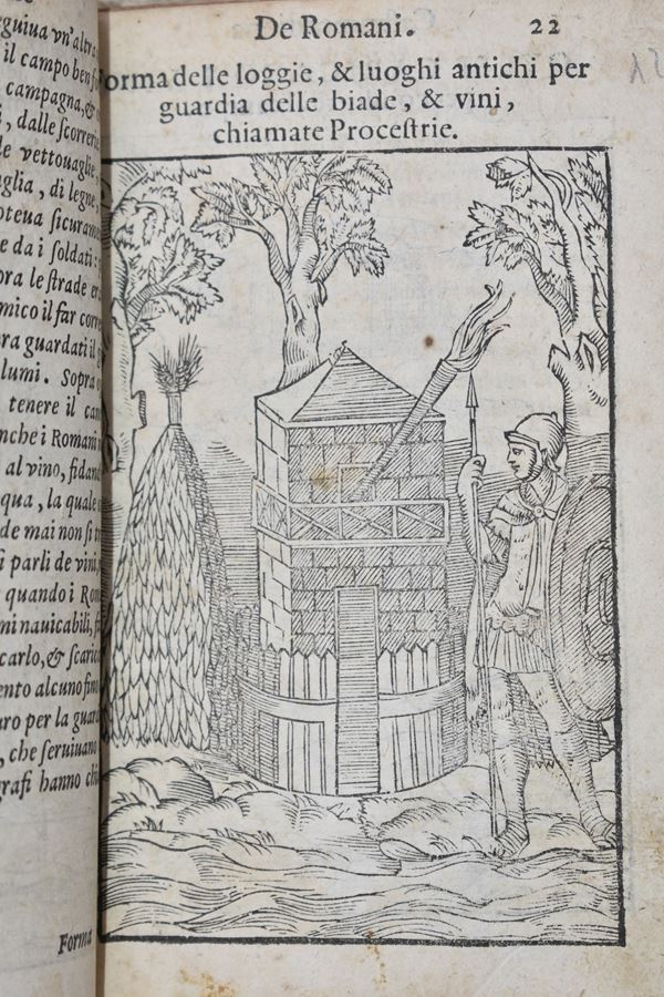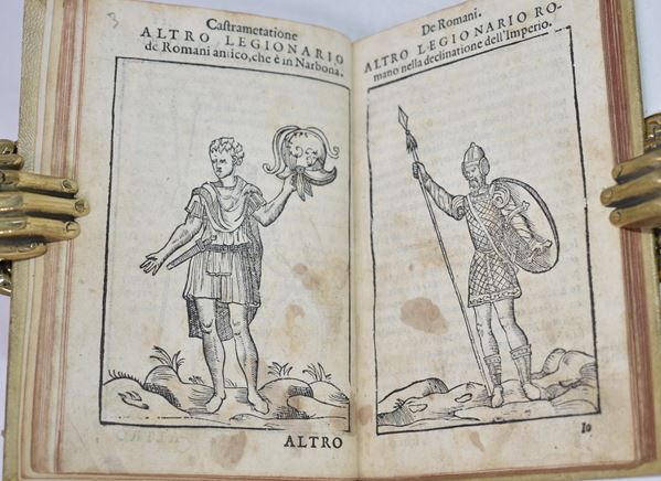 Rare 16th century illustrated book on the art of arranging military camps, with typographical mark engraved in wood on the frontispiece (Minerva rides a wolf) and numerous engravings in the text depicting uniforms and scenes from the life of ancient Roman, Greek and Turkish soldiers, the construction of the castrum, gladiators, war scenes, baths and body care, and more. Mutilated copy of 5 cards.