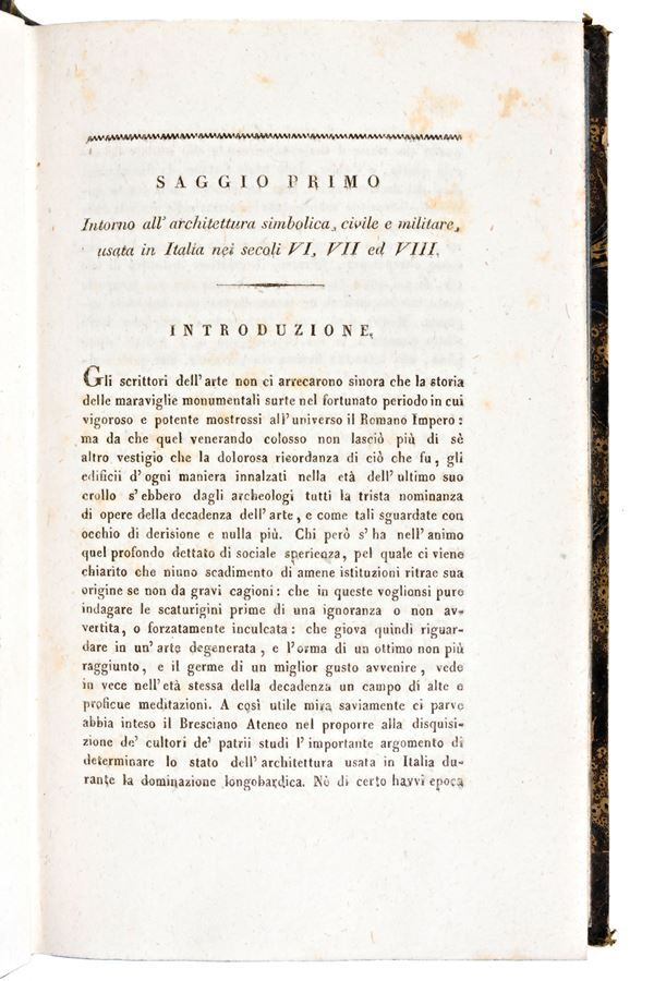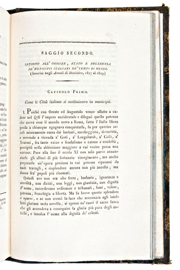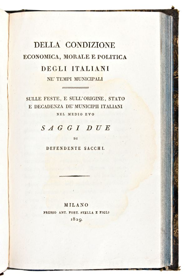 Titles: On the economic, moral and political condition of the Italians in the lower times. First essay on the symbolic, civil and military architecture used in Italy in the 6th, 7th and 8th centuries and on the origin of the Lombards, their domination in Italy, the division of the two peoples and their uses, worship and customs. 2nd part with its own frontispiece: On the economic, moral and political condition of the Italians in the municipal times. On the celebrations, and on the origin, state and decline of the Italian municipalities in the Middle Ages. Two essays by Defendente Sacchi. Old complete edition in 2 volumes printed in Milan between 1828 and 1829 by Antonio Fortunato Stella & Sons. Work of the cousins Giuseppe (1804-1891) and Defendente Sacchi (1796-1840).