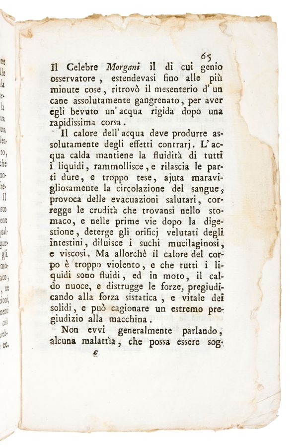 Enclosed with a pamphlet, title: Warnings on how to treat and govern livestock well. With the addition of the curative and preservative method against pleuro-peripneumonia, commonly called pulmonary... By Mr. Antonio Ferdenzi, public veterinary professor... Mantua, in the Giuseppe Braglia printing house 1795. In-8, mm. 190x120, pp. 86. Paper E1 is detached (p. 65-66). Slight halo in the margin of the text. Front. with ink dots.