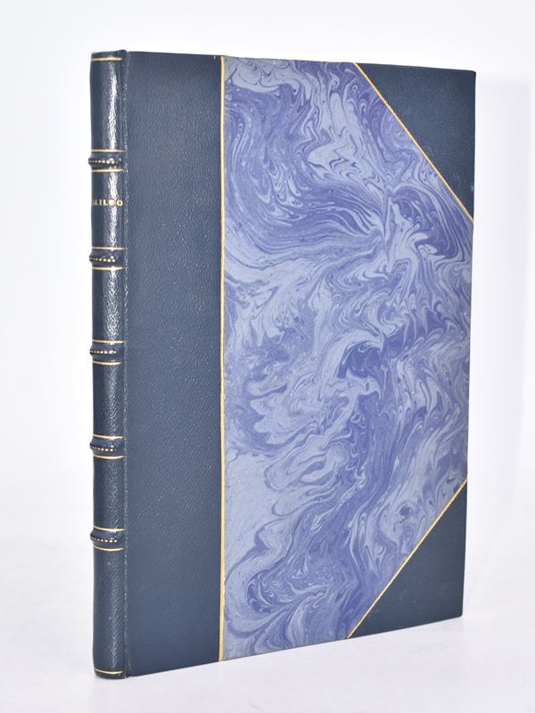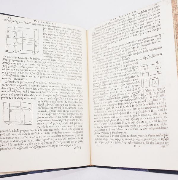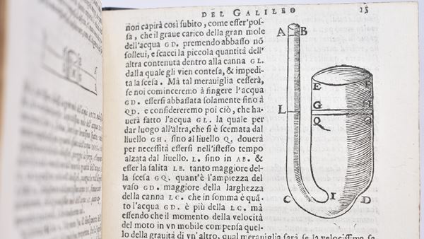 Excerpt from the second edition of the first complete collection of the works of Galileo Galilei, produced by the Bolognese printer Evangelista Dozza; frontispiece with a typographical mark, various engravings in the text, initials with woodcut headers and tailpieces in the text.