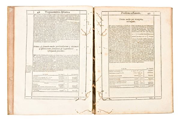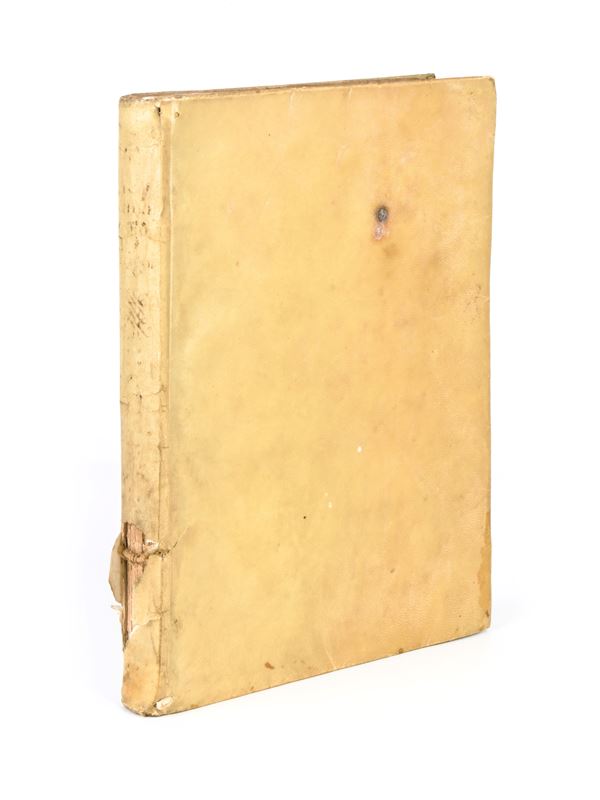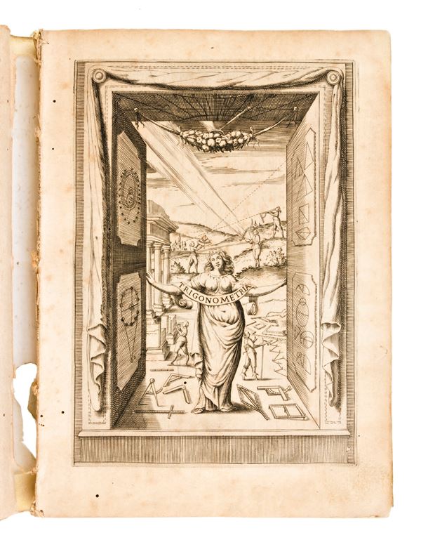 In-4° (mm 228x156), Pages 16, 71, [1] and Cards [52] of trigonometric tables, with 1 beautiful allegorical frontispiece engraved in copper by Andrea Salmanico, depicting Trigonometry with various instruments at the feet and geometric figures at the sides (trimmed in the lower margin) and 1 engraved plate of diagrams at the end. Contemporary binding in full parchment with losses on the spine, woodworm tracks on the internal margin of the text that invade the printed part on some cards. Complete