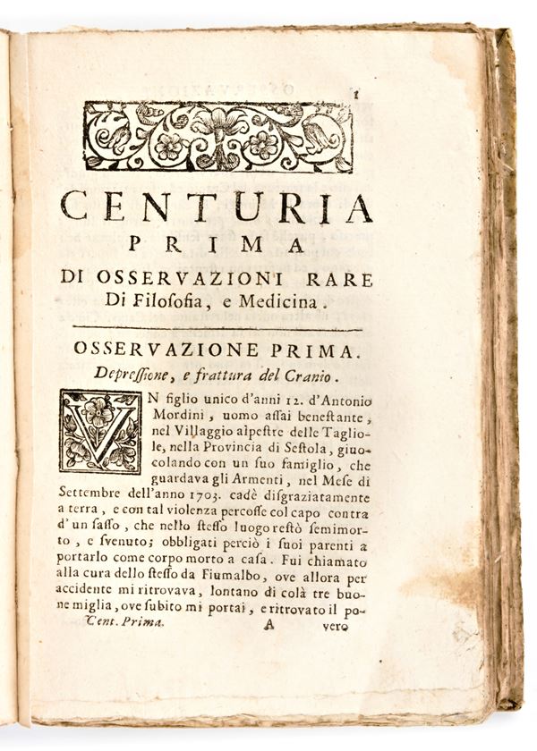Second impression corrected, cleaned, and enlarged. In Venice in 1731 at Giuseppe Corona, work of the Italian physician and alchemist Fulvio Gherli (1670-1735). Collection of one hundred medical-surgical observations (Depression and fracture of the skull, very severe headache, ophthalmia, kidney stones, abortion with hemorrhage, fever, tumors, etc.) with therapeutic annotations by the author. Italian text. Woodcut headpieces, initials, and tailpieces. Printer's mark on the front. (Crown supported by two putti in a floral frame).
