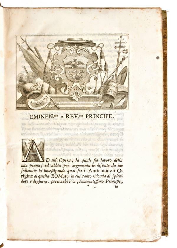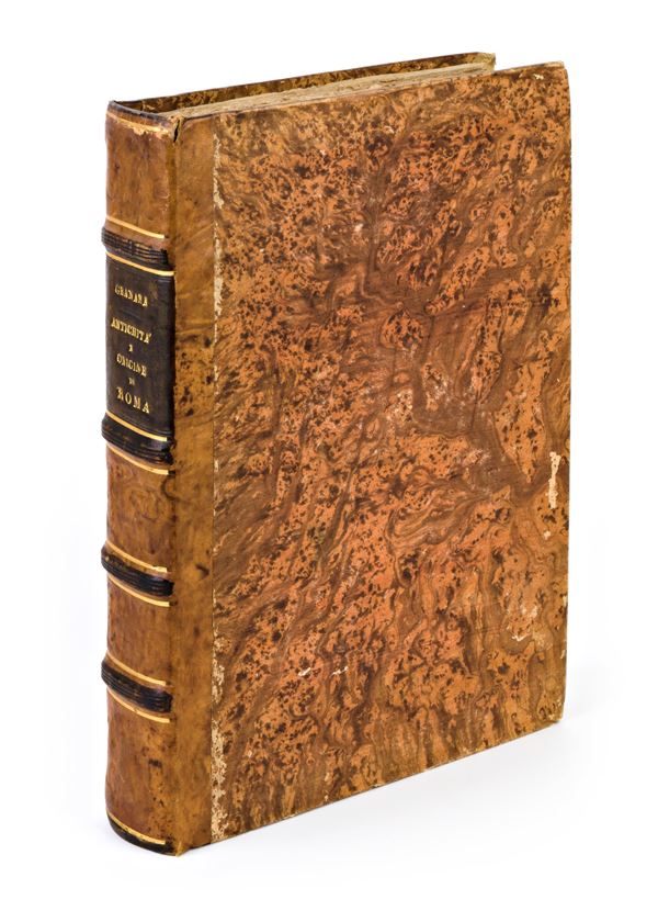 Format in-4ยฐ, mm. 305x220, pp. (24), 756, (2) + 1 c. of folding plates. This copy lacks the frontispiece. Later binding (19th century) in half leather with 4 ribs, gold titles and blind-stamped decorations on the spine. Decorative old paper covers. Frontispiece (partially detached) printed in red and black with copperplate vignette. 1 folding copperplate with Roman coins. Headers and tailpieces with copperplate vignettes. Clear text, with slight foxing on the leaves. Old edition printed in Venice in 1734 by Giammaria Lazzaroni.