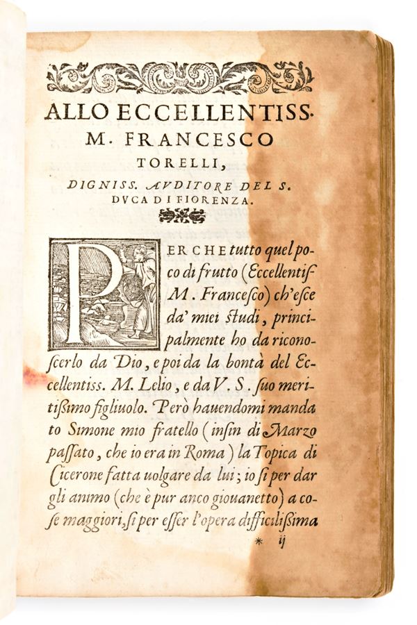 Cinquecentina printed in Venice in 1556 by Gabriele Giolito de Ferrari, with an Italian translation by Simone Della Barba (16th century). Rhetorical work by Cicero composed in July 44 BC addressed to his friend the jurist Gaius Trebatius Testa, who had asked Cicero to state and simplify the content of Aristotle's Topica, and deals with topikΓ©, or the art of finding arguments during the inventio phase. The "places" (topoi or loci communes) to which the term topica refers are, according to Aristotle, the places from which arguments are drawn, that is, the commonplaces that can be used in the preparation of a speech, but also in the drafting of a philosophical or poetic work.