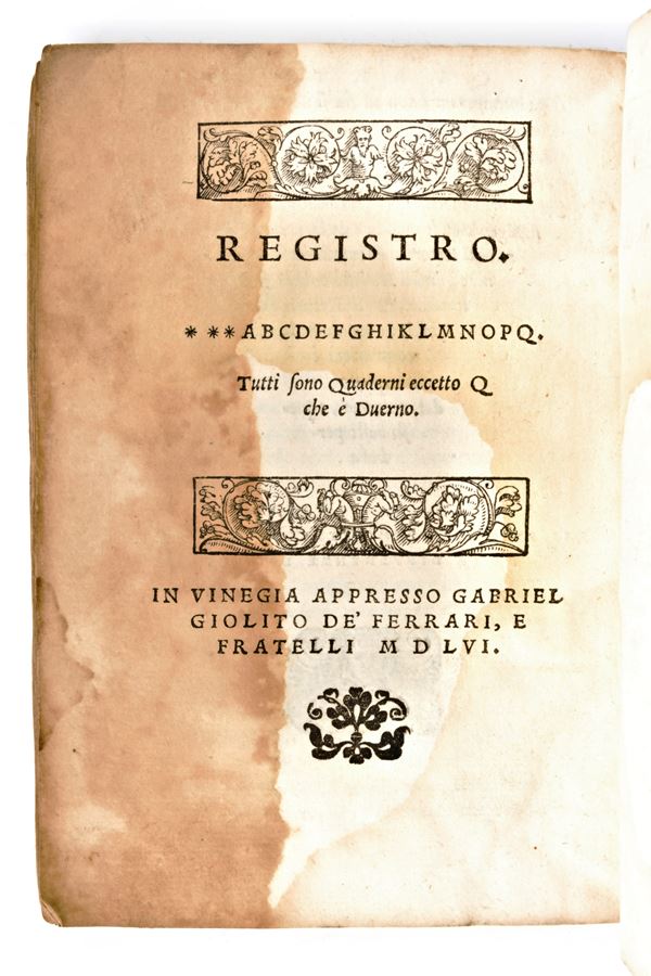 Format in-8Β°, mm. 150x105, pp. (30), 245, (3). Missing the *3 leaf (the first of the index). Contemporary binding in full parchment with handwritten titles on the spine (faded). Halo sign taking part of the text. Rare underlining in ancient ink.