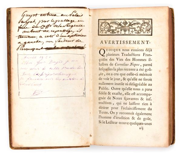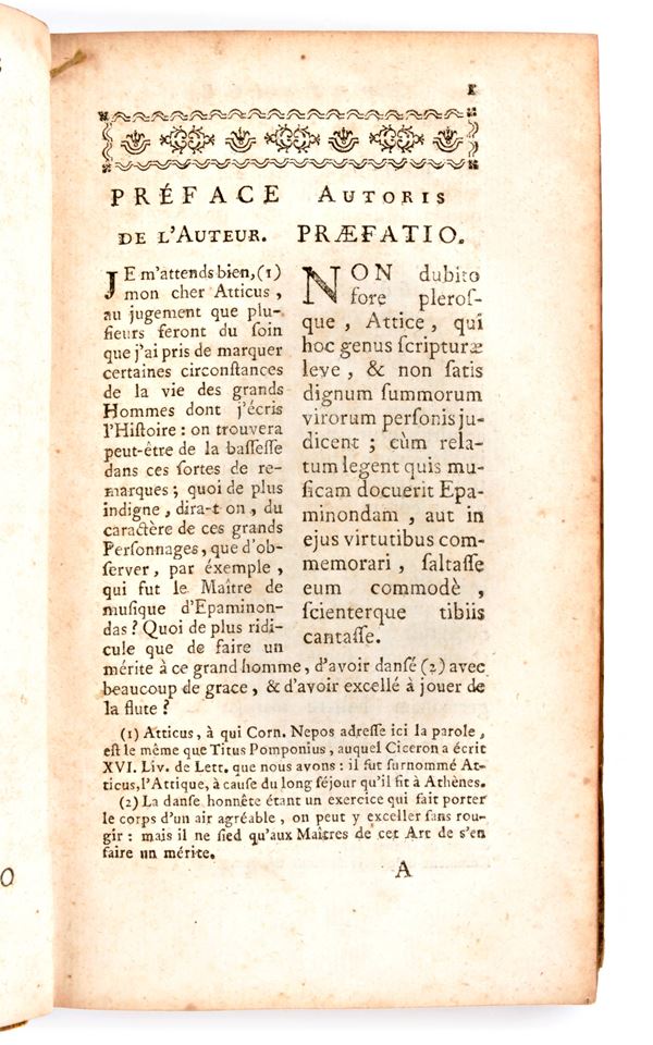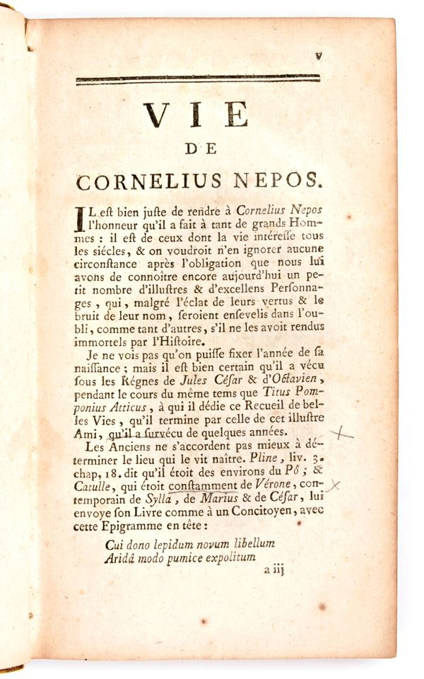 Old edition printed in Paris in 1759, works of the ancient Roman historian and biographer Cornelius Nepos (100 BC - 27 BC). Latin text, with a French translation on the facing page, geographical, historical and critical notes. Contains the lives of: Miltiades, Themistocles, Aristides, Pausanias, Cimon, Lysander, Alcibiades, Thrasybulus, Conon, Dion, Iphicrates, Chabrias, Timotheus, Datames, Epaminondas, Pelopidas, Agesilaus, Eumenes of Cardia, Phocion, Timoleon, Hamilcar Barca, Hannibal, and finally the Roman historians Cato and Atticus.