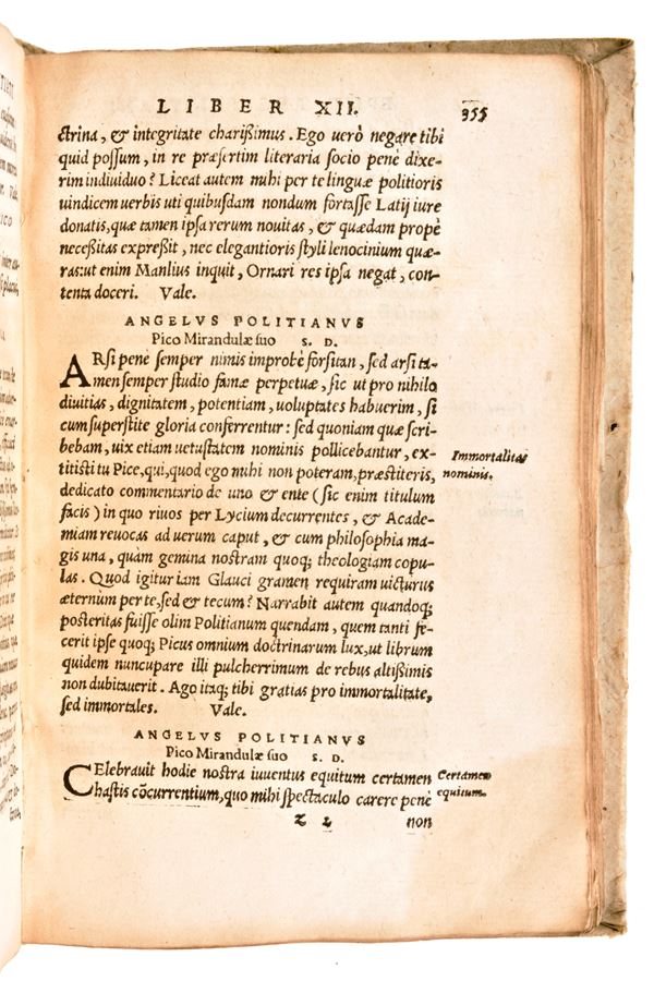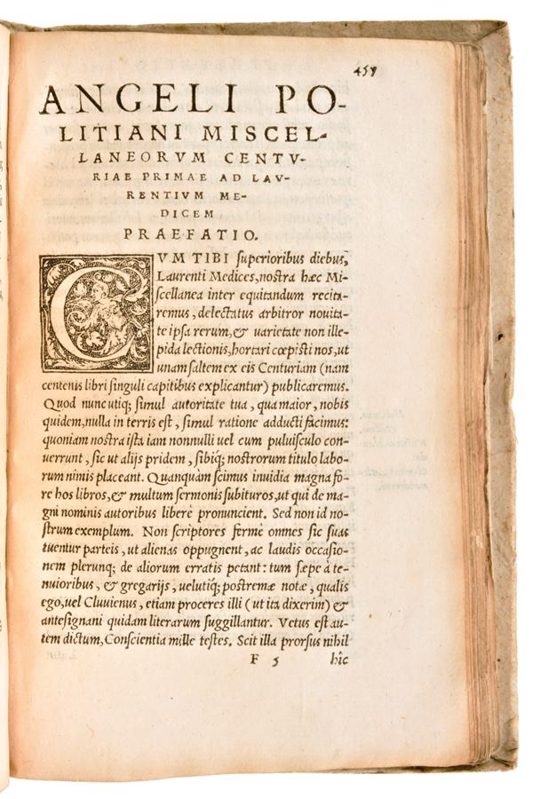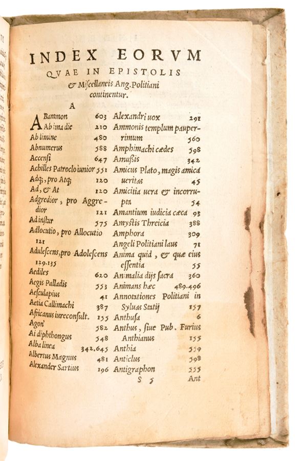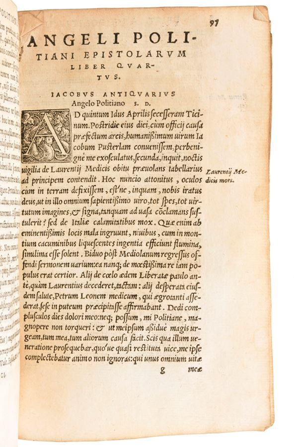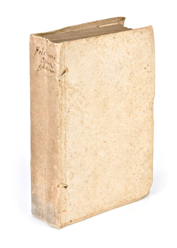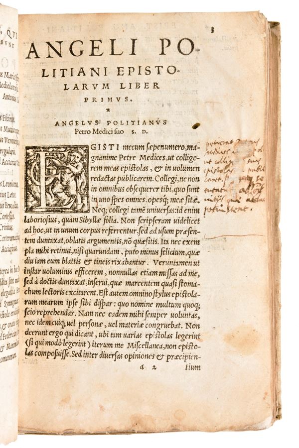 Cinquecentina printed in Lyon in 1550 for Sebatien Gryphius. Work of the Italian humanist Angelo Poliziano (1454-1494), only Volume 1 (of 3), containing the Espistolarum Libros XII & Miscelleanorum Centuriam I. Typographic device on the title page. Latin text, Roman italics. Woodcut capital letters.