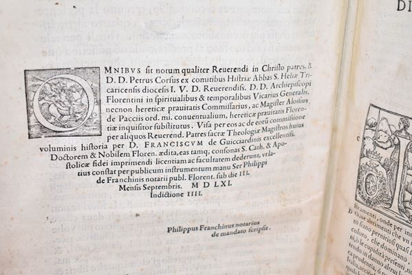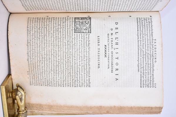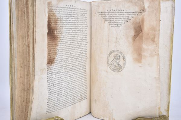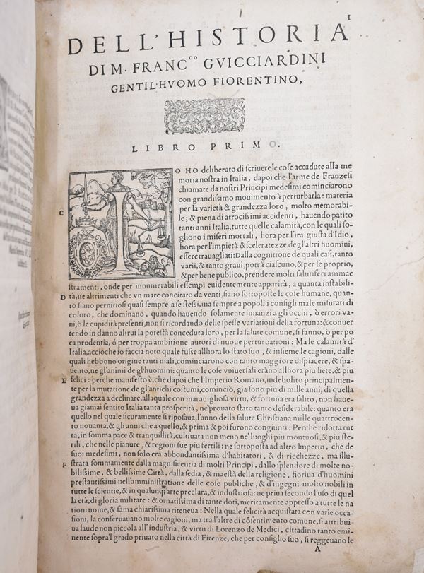 Original folio edition of the historical treatise by F. Guicciardini (1483-1540), printed in Florence with a large typ. (Medici coat of arms surmounted by a crown, in an illustrated frame) engraved in wood on the frontispiece; with the portrait applied to the recto of the last leaf, finely engraved initials with woodcut decorations in the text. The work recounts in sixteen books the main events that occurred between the death of Lorenzo the Magnificent (1492) and of Pope Clement VII (1534). Complete, with restored frontispiece, slight oxidations, stains and marginal restorations on the final leaves.