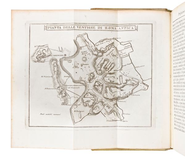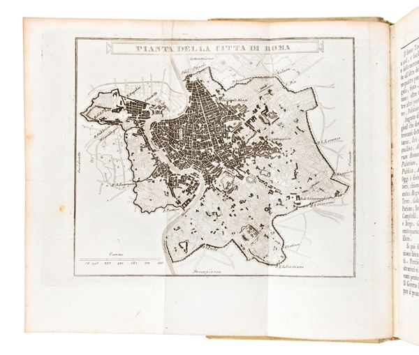 Format in-12ยฐ, mm. 190x110, pp. XXXXI, 336, 2 c. of folding plates, 28 c. of plates / from (2), 351 to 702, 24 c. of plates. P. 570-599 are omitted in the numbering, 2 plates are identical (piazza di Capidoglio), First volume with the last 4 text cards missing. Contemporary full parchment binding with titles and decorations (on leather inserts) on the spine. Spray edges on the cards (blue). Clean cards with clear text, sporadic foxing and small stains. Third original edition of 1830 in 2 volumes bound in a single volume. Eyelets and title pages preserved. Famous guide to Rome by the historian and archaeologist Antonio Nibby (1792-1839), with 54 total plates and 2 fold-out plans of the city of Rome in the preface.