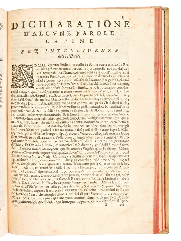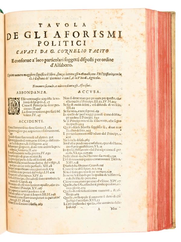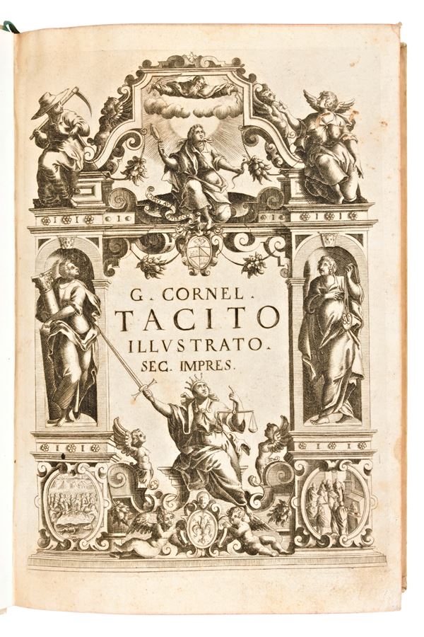 Format in-8ยฐ, mm. 255x180, pp. (72), 544, (132), (168), (48), 83. Complete. Small ink stain on cc7 paper with loss of text, woodworm work on the lower margin from p. 61 to p. 154 and on the upper margin from p. 195 to p. 260. Small holes on the woodcut frontispiece with small losses. Frontispiece printed in red and black with the lily in red. Double-page map of the Roman Empire (Engraving). Woodcut initials and tailpieces in the text. Caroli Ceriana Mayneri ex libris on coat of arms applied to the first white page. Elegant back binding in full smooth parchment with 5 ribs, handwritten title on the spine, trimmed margins, red cuts. Old seventeenth-century edition (in Venice in 1628, by Giunti) of the Works of Tacitus (Annals, Historia, Germanic Customs and Traditions and Life of Agricola) with the aphorisms of the Spaniard Baltasar Alamos de Barrientos (1555-1640) translated into Italian by the linguist Girolamo Canini (1551-1631) and the translator Andriano Politi (1542-1625). With the table of aphorisms, table of commonplaces, comparisons of some places and finally the Declaration of some Latin words for the understanding of the history of Adriano Politi.