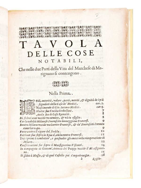 Life of Gio. Iacomo Medici, Marquis of Marignano, most valiant and most indubitable Captain General; in which, in addition to the victories he had for himself against the Duke of Milan, and against the Grigioni, and ... Described by Marc'Antonio Missaglia... In Milan by Locarni & Bordoni, 1605. History and memory of the Italian leader Gian Giacomo Medici called Medeghino (1495-1555), described in Italian by the biographer Marc'Antonio Missaglia (died 1575). Format in-8ยฐ, pp. (24), 194, (2). Printer's device on the title page. Headers, tailpiece and initials in the text. Elegant post-mutual binding in full parchment. Restored to the margins and corners of the pages. Sporadic foxing and browning.