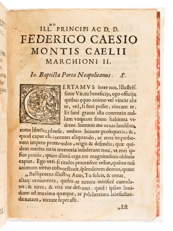 I. Baptistae Portae Neapolitani Elementorum curuilineorum libri tres. In quibus altera geometriae parte restituta, agitur de circuli quadratura. Ad illustrimum ... Federicum Caesium. Romae apud Bartholomeaum Zannettum, 1610. Treatise on geometry by the famous Italian philosopher and alchemist Giovanni Battista Della Porta (1535-1615), inspired by Euclid's Elementa. Printed in Rome in 1610 for Bartolomeo Zanetti. Coat of arms on the title page. Latin text. Numerous geometric figures and demonstrative formulas in the text. Format in-4ยฐ, pp. (8), 96, (4). Post. silent hardback. Marbled cuts. Sporadic foxing, light stains and small marginal restorations.