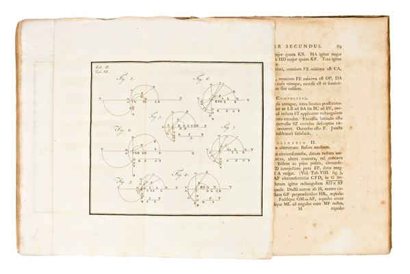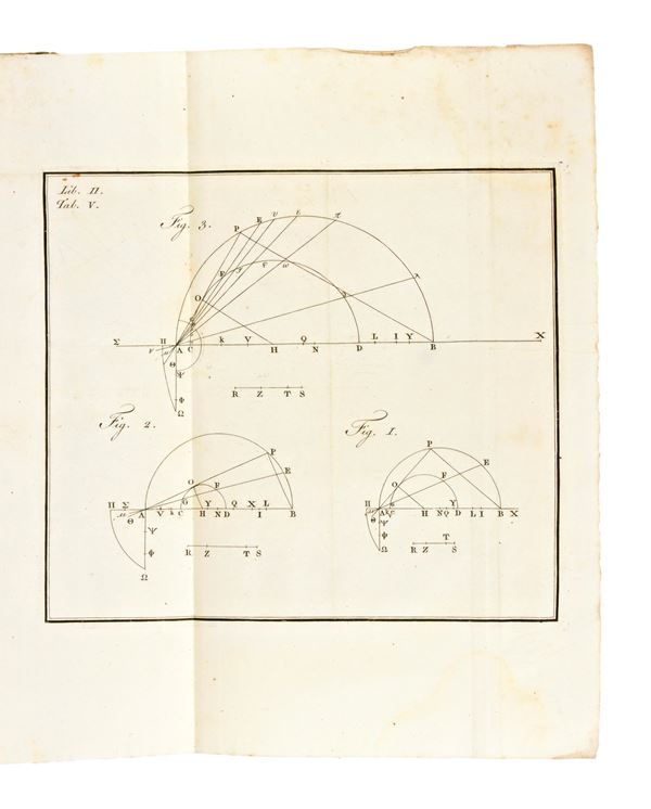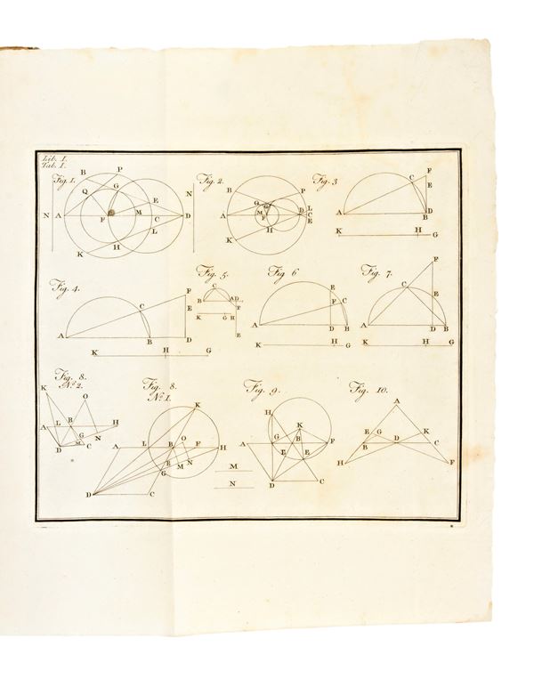 In-4ยฐ, mm. 285x225, pp. (8), 115, (1), 13 cc. of folded copperplate plates depicting geometric figures. Complete. Hardback. One copy is missing the spine, with partially detached hinges. Maps and plates in excellent condition with slight signs of aging. Work of Apollonius of Perga (ancient Greek mathematician), edited by Samuel Horsley (1733-1806), British mathematician and physicist. Original edition printed in Oxford in 1770. Latin text.