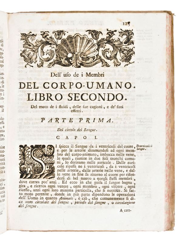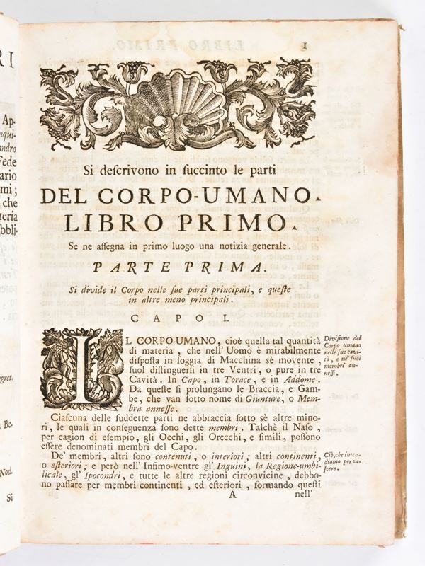 Format in-8°, mm. 235x175, pp. (8), 255, 52, 21 cc. of plates. Complete. Back binding. In full old parchment with gold titles on the spine. Sprayed edges of the pages. Frontispiece printed in red and black with woodcut vignette, restored with old paper reapplied to the back. Woodcut initials, headpieces and tailpieces in the text. Copperplate frontispiece bound at the end together with the 20 anatomy plates outside the text. Work of Alessandro Pascoli Perugino (1669-1757), doctor and anatomist, taught in Rome and Perugia. He gave anatomical demonstrations by dissecting cadavers, like his colleague and competitor Andreas Vesalius. He maintained a vast correspondence with intellectuals from all over Europe. His philosophical and scientific works follow the methods of René Descartes and Nicolas Malebranche. His treatises on metaphysics, medicine and mathematics exhibit a coherent and methodical thought that demonstrates the philosophical vitality of Italian culture of the period. Presented as one of the most thorough and exhaustive treatises on the organs of the human body and their specific functions, first published in 1700, it was so successful that numerous further editions followed.