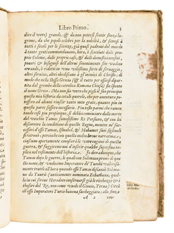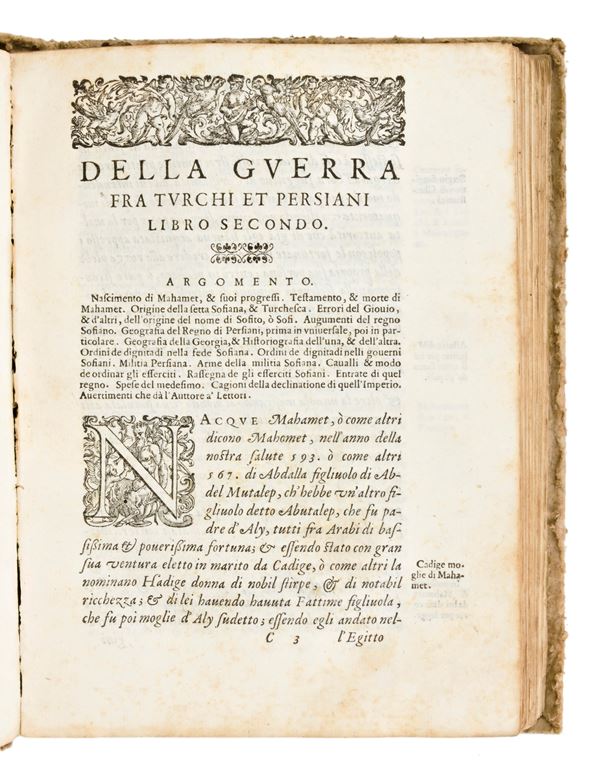 In-8ยฐ, mm. 220x170, pp. (32), 365, (41). Missing: the folded plate with map and the cards Q8, R1 and Z8. The last card Cc4 is restored with old paper applied to the back. A2 card with lower corner cut. Contemporary hardback. Handwritten titles on the spine and at the bottom edge. Italian text, roman italics. Loose binding with some cards partially detached. Light foxing and light stains on some cards. Woodcut headpieces and initials nt