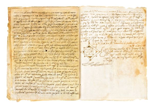 Ancient notarial manuscript of Paolo and Cesare Rinaldi dated 1568 with seal and handwritten signatures on the recto of the last leaf. In-8ยฐ (225x145 mm.) booklet entirely made of 14 parchment sheets including covers. Entirely handwritten in Latin except for the verso of the first leaf and the last one which only bears the inscription "Instri diversi di Paolo er Cesare Rinaldi". Good state of preservation, hole in the center of the text that runs through the entire volume.