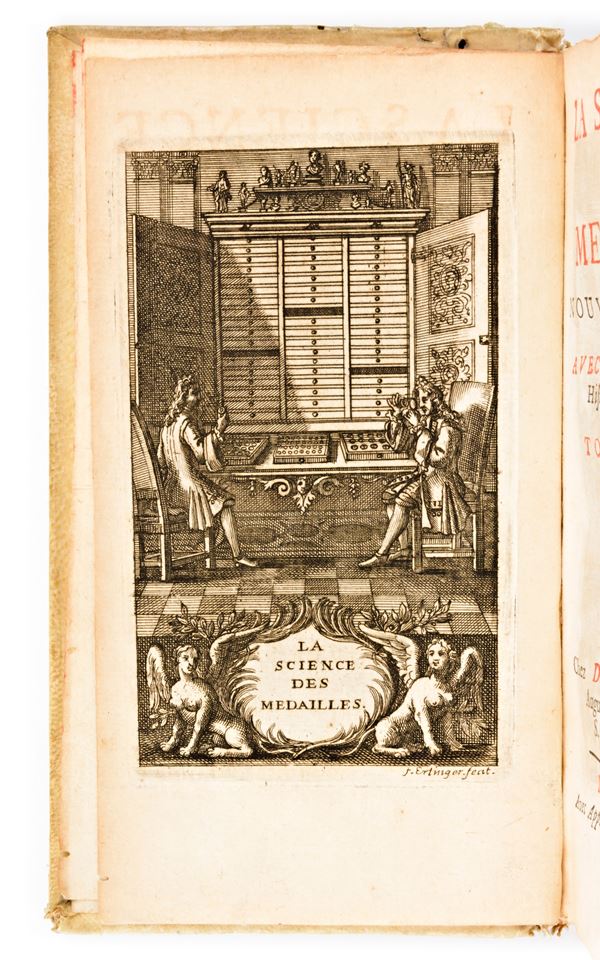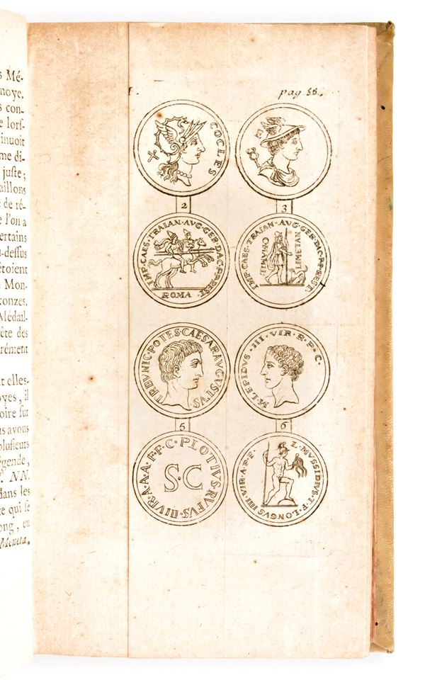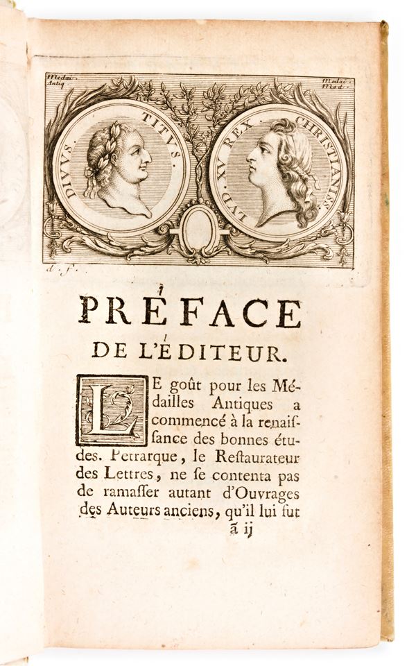 Old complete Parisian edition in 2 volumes. Printed in 1744 by Jean Debure (1721-1786). Title pages printed in red and black. 1 copperplate frontispiece to the first volume. Work of the French numismatist Louis Jobert (1637-1719), with 12 folding plates engraved outside the text depicting medals with portraits of the Roman emperors and their respective popes. Woodcut headpieces, initials and tailpieces.