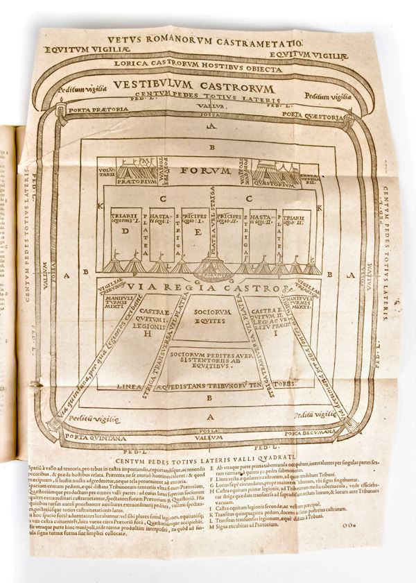 Format in-4°, mm. 240x170, pp. (38), 663, (98), 2 cc. of folding plates / (8), 156. Complete. Contemporary binding in full parchment with handwritten titles on the spine, plates with cloth ties (removed). Cards trimmed with blue edges. Very good copy, with minor defects and light foxing on cards. Latin text. Typographical marks on title pages. Woodcut headpieces, initials and endpieces. Woodcut medals and figures in the text. 2 folding tables (Map of Rome & vestibule of via Regia castro) to the first work.