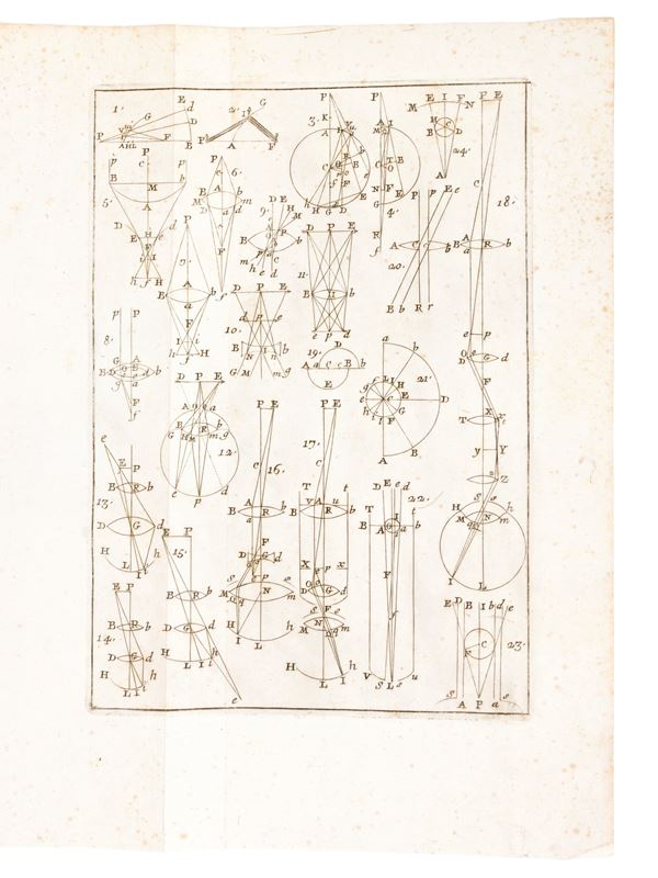 De lentibus et telescopiis dioptricis dissertatio author P. Rogerio Josepho Boscovich. Ex Typographia Andreae De Rubeis, Rome 1755. Rare first edition of the studies on dioptric lenses and telescopes by the mathematician Ruggero Giuseppe Boscovich (1711-1787). Printed in Rome in 1755 by Andrea De Rossi publisher. Header and initials on f. A2. With woodcut on the front. Demonstrative formulas in the text and at the end 1 folded plate depicting geometric figures. Post-mute binding in full parchment. In-4ยฐ, pp. 58, 1 c. of folded plates.