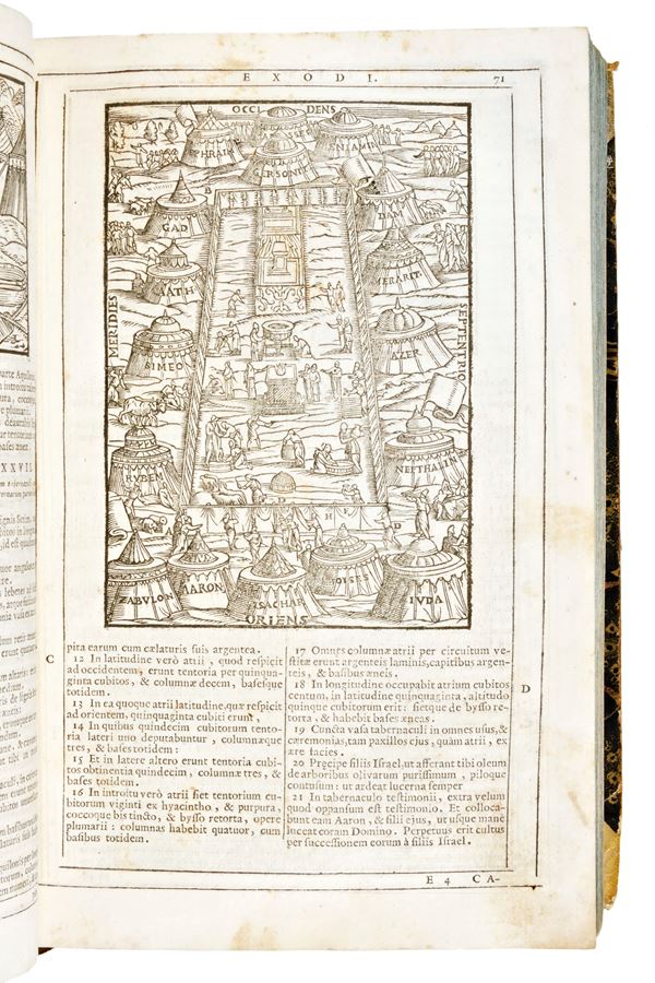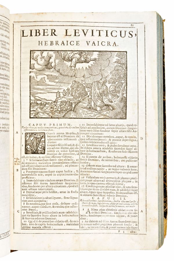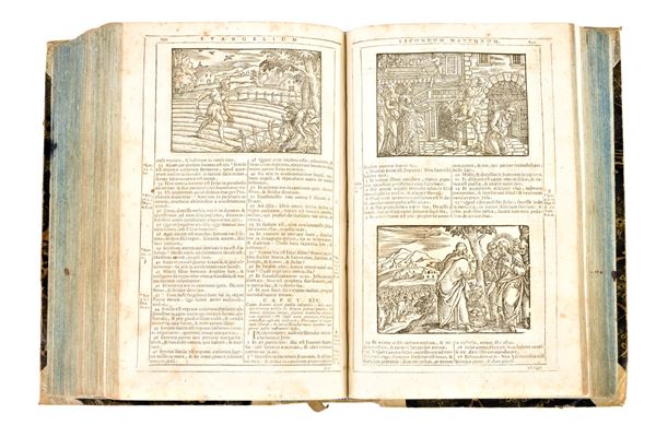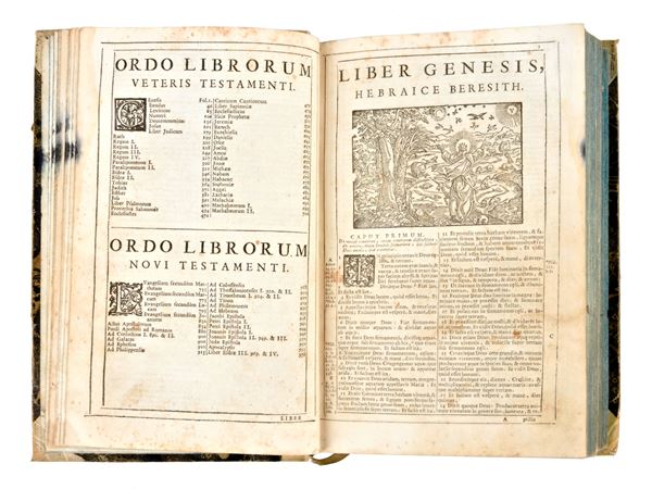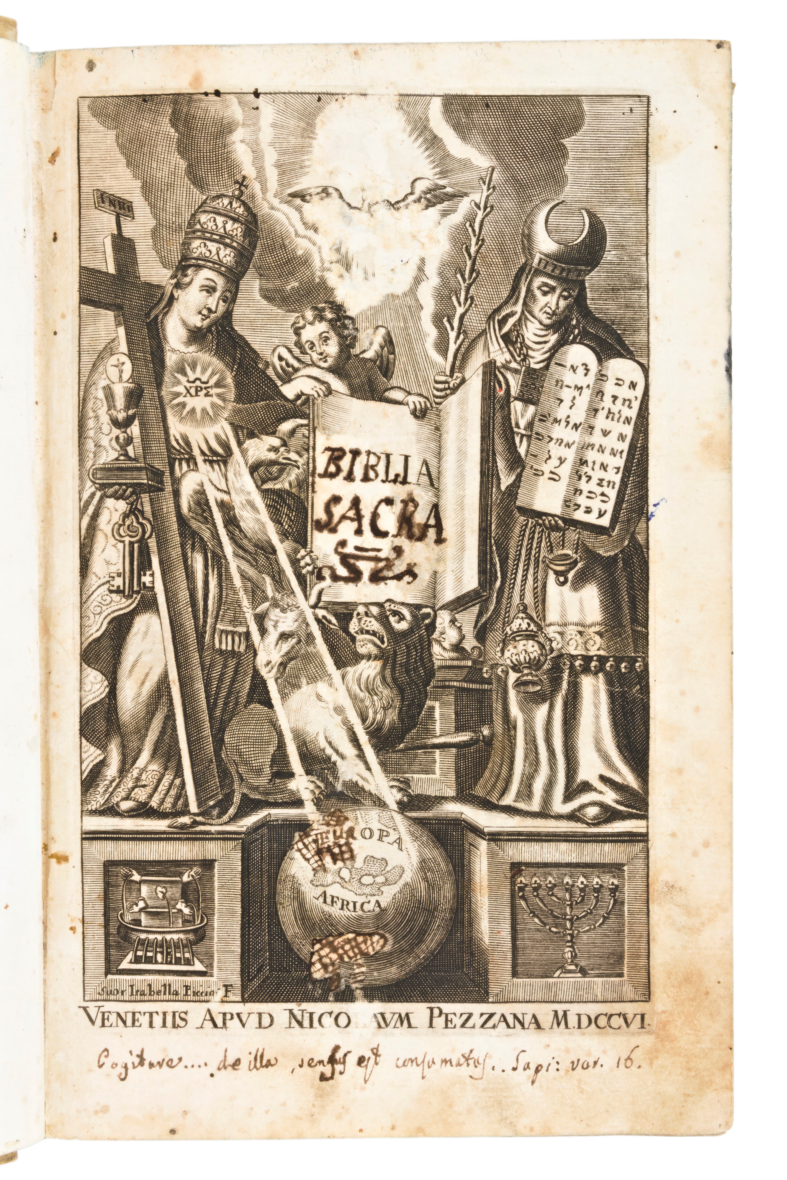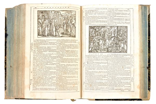 Title: Biblia sacra vulgatae editionis, Sixti 5. Pontificis Max. jussu recognita, et Clementis 8. auctoritate edita; versiculis distincta, et ad singula capita argumentis aucta; pluribusque imaginibus, ad historiarum nototiam politissimè elaborates, ornata; indiceque epistolarum, & evangeliorum locupletata. Ancient illustrated Bible (Old and New Testament) printed in Venice in 1706 for Nicolò Pezzana, richly illustrated with numerous woodcut figures in the text. Latin text, printed in two columns within a frame. Woodcut drop caps. Title page printed in red and black with typographic brand (Giglio).