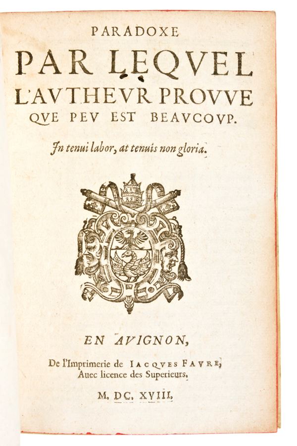 In-8ยฐ pp. 20 full contemporary pulp with gold decorations, excellent condition; together with: Paradoxe par Lequel The author provides that it is too small - En Avignon 1618 by the printing house of Iaques Faure (2).