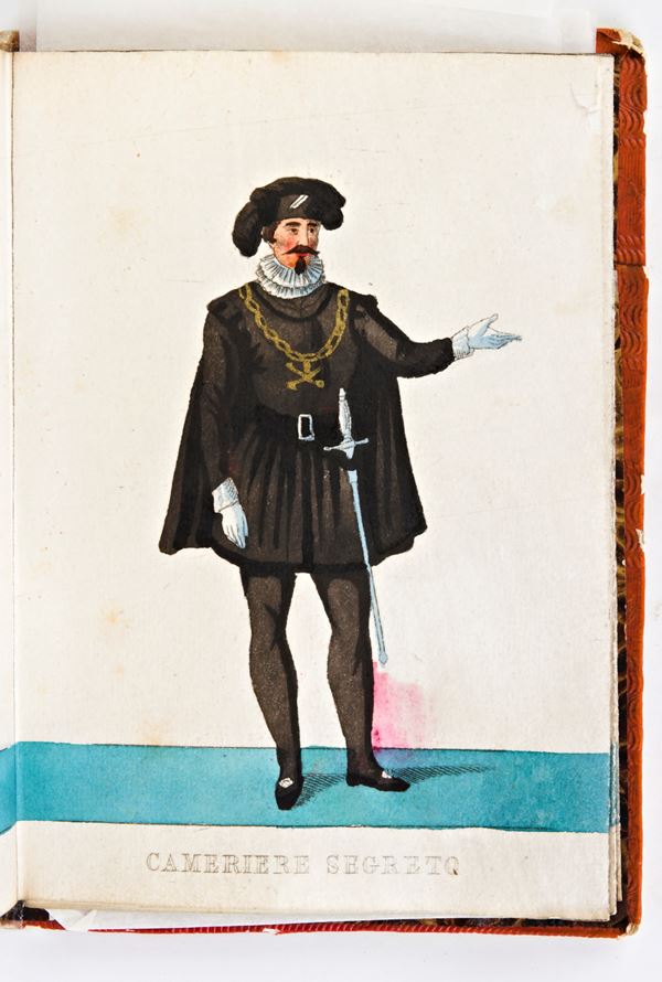 Piccolo album a leporello contenente 30 incisioni a colori d’epoca  acquerellate a mano riproducenti costumi ecclesiastici della corte Pontificia.  1830 ca.