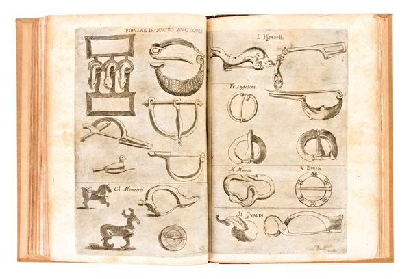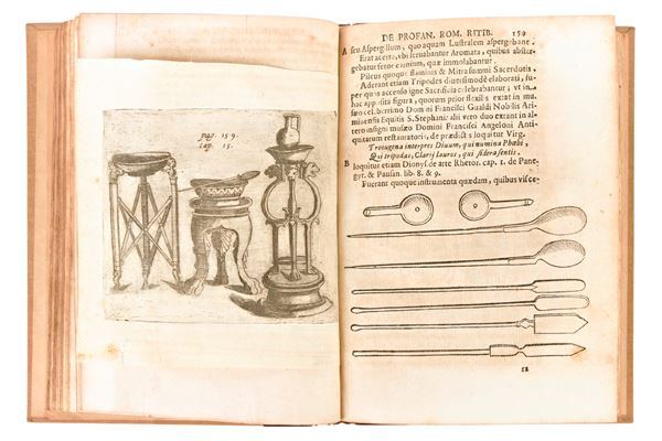 First edition printed in Rome in 1644 by Andrea Phaei, second volume of De profanis, et sacris veteribus ritibus (3 vols., 1644-1645), mainly concerning Roman antiquities and rites. Work of the Italian scholar Giovanni Battista Casali (1578-1648). With 5 chalcographic plates, 6 folding plates and some woodcut figures in the text (medals, portraits, epigraphs, tools). Calcographic coat of arms of the cardinal of the dedicatee Alessandro Bichio on the frontispiece.