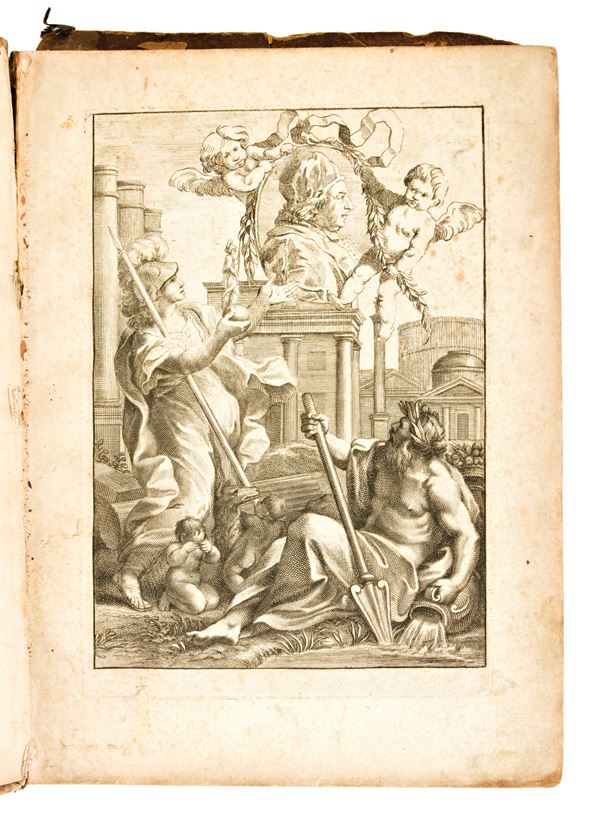 Format in-8ยฐ, mm. 290x215, pp. (12), 195, (8), 77, (1 blank). 2 parts in 1 volume. Missing 1 plate (p. 185). Contemporary binding detached, with defects on the covers and parts of the spine sectioned. Well preserved text with sporadic foxing. Cuts in red. Copperplate frontispiece and frontispiece printed in red and black with typographic device (papal coat of arms).