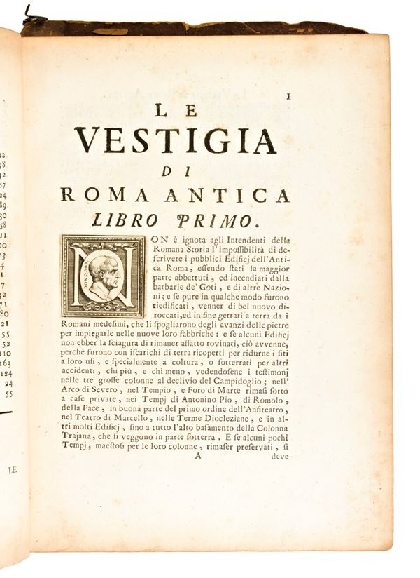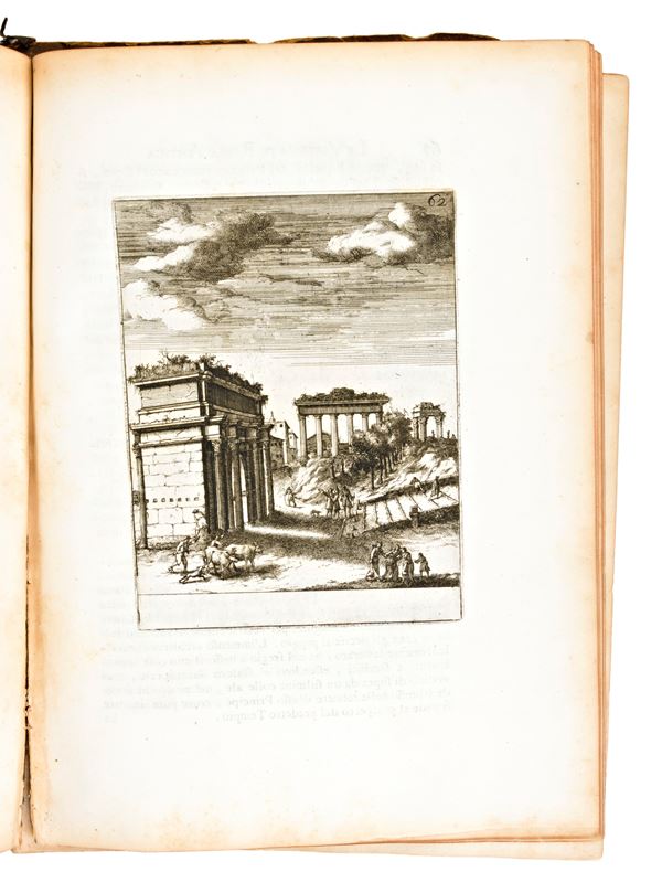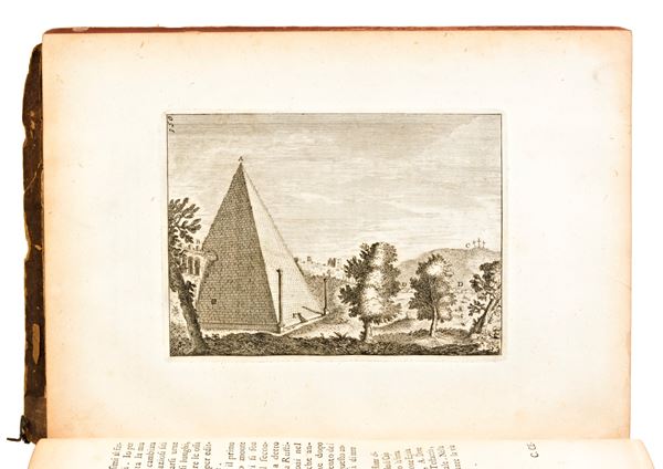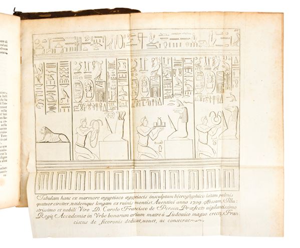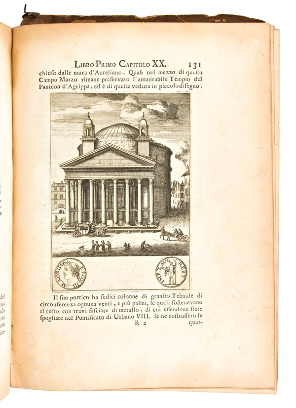 First edition printed in Rome in 1744 for Girolamo Mainardi, by Francesco de' Ficoroni (1664-1747), a well-known collector, antiquarian and archaeologist. Numerous chalcographic figures in the text depicting medals, coins and portraits. Includes 38 chalcographic plates outside the text depicting the monuments of ancient Rome and 1 fold-out plate with hieroglyphics. Second part introduced with a loop.