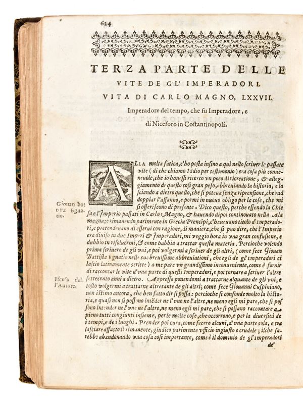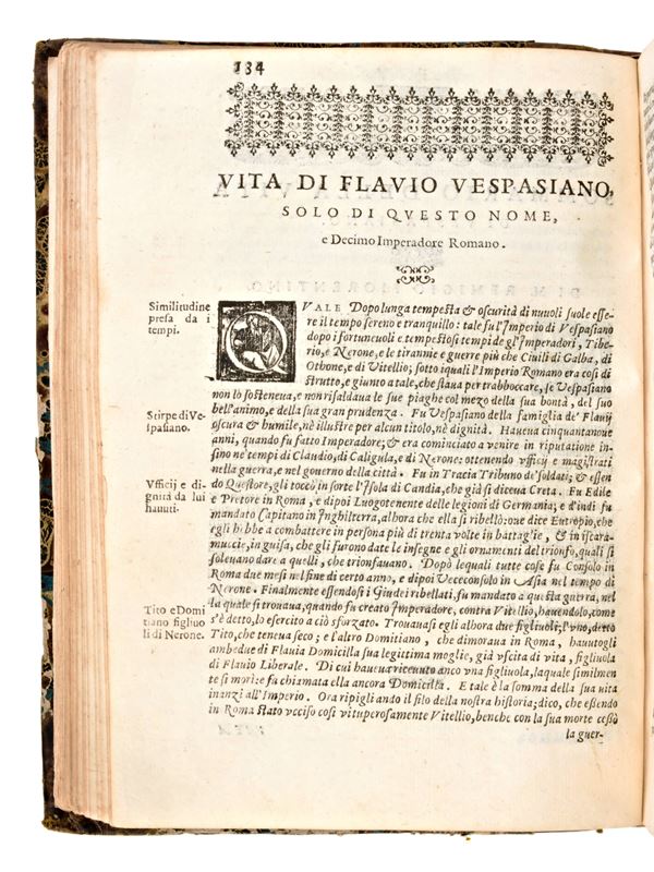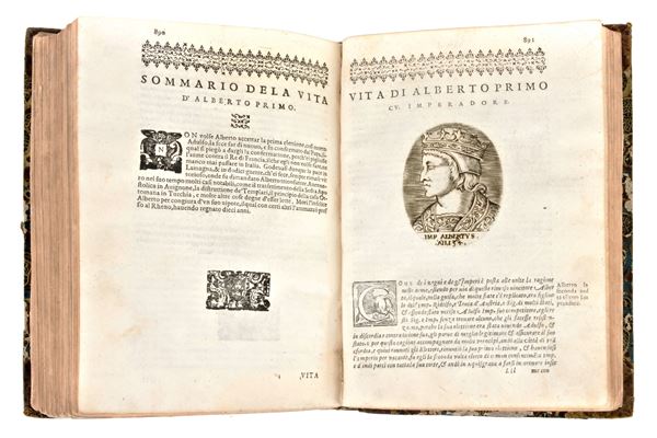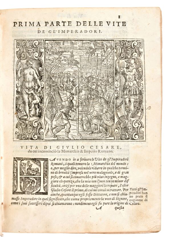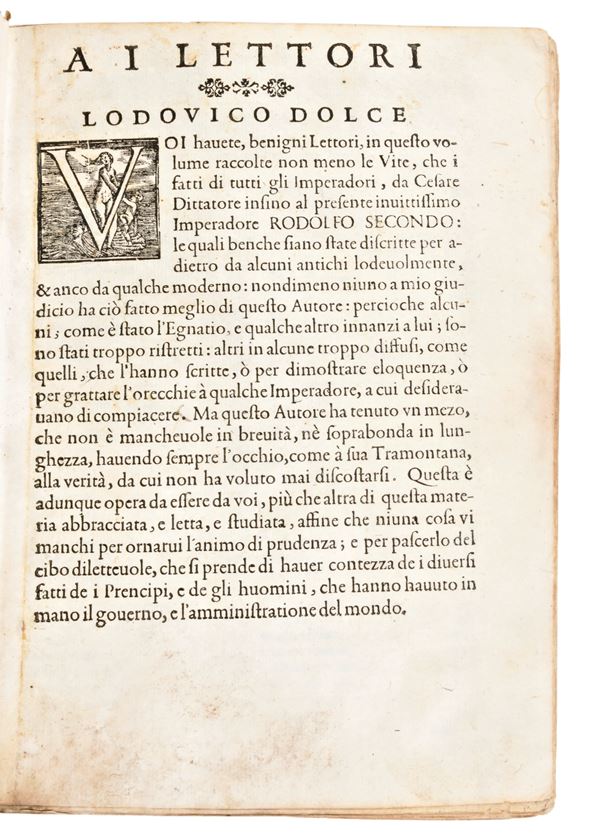 The Lives of all the Roman Emperors from Julius Caesar to Ridolfo II. Taken by M. Lodouico Dolce from the Spanish book by the noble knight Pietro Messia. Added the portraits of the emperors of the House of Austria ... With a compendium of the lives of the Roman Pontiffs, and their portraits. Printed in Venice in 1610 by Alessandro de' Vecchi. Printer's device in woodcut on the colophon. Portrait of Ridolfo II in copperplate on the frontispiece. Numerous portraits engraved in copperplate in the text. Woodcut headpieces, initials and finals. Large headpiece with woodcut vignette on f. A1. Translation from Spanish into Italian by Ludovico Dolce (c. 1508-1568), a well-known Italian writer and grammarian.