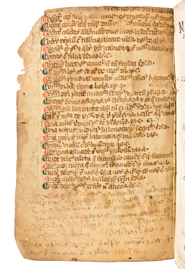 Full parchment binding with reuse of a polychrome medieval manuscript and hints of ancient colouring on the frontispiece. Two separate frontispieces, text composed of 68 continuously numbered pages. In good condition with small losses on the frontispiece and normal signs of aging. Complete
