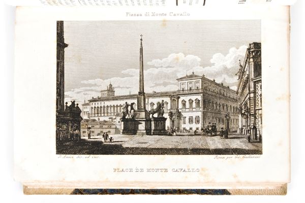 Old original edition of 1846, printed in Rome by Giovanni Gallarini. Guide to Rome composed by Erasmo Pistolesi (1770-1860), in the preface a folding map of the city of Rome composed especially for this edition (1846) by Filippo Troiani from Rome. Edition with 7 plates engraved outside the text, titles: Roman Forum, Interior of St. John Lateran, Interior of St. Mary Major, Piazza di Monte Cavallo, Interior of the Pantheon, Gate of St. Paul and Interior of St. Peter in the Vatican, by the engravers Domenico Amico (c. 1808-1873?) and Gaetano Cottafavi (19th century) for the plate on the frontispiece.