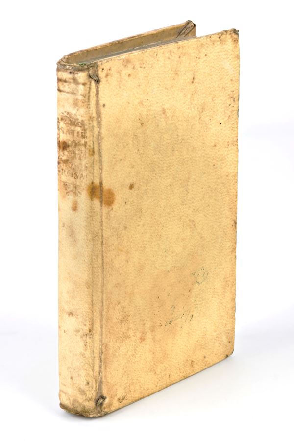 Format in-8ยฐ, mm. 145x95, pp. (2), 34, 16 + 150, (6). Contemporary full parchment binding with gold titles on the spine. Sporadic foxing. Collection of 6 satires by the Italian poet Lodovico Sergardi (1660-1726), edition printed in Spoleto in 1698. Printer's device on the front (lily).