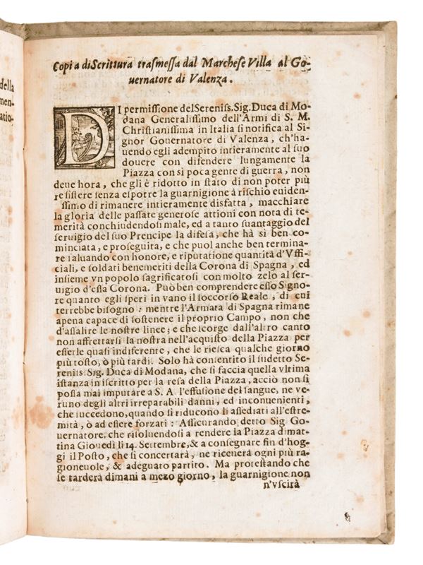 In-4ยฐ, mm. 200x150, pp. (4), 110, (8). Last c. blank. Contemporary hardback with handwritten titles on the spine. Edges of the leaves in blue. Light stain with small tear on the upper corner of the title page. Rare and complete work describing Valenza, an isolated, desperate city, in a food crisis, which will have to capitulate to the French, Savoy and Modena troops.