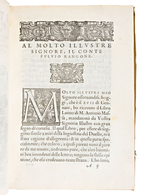 Anti-dueling treatise by the Italian physician and humanist Giovanni Battista Susio (1519-1583). Cinquecentina printed in Venice in 1558 (the first 1555) for Gabriel Giolito de Ferrari. Large woodcut typographic device on the title page and colophon. Italian text, roman italics. Woodcut headpieces and initials.