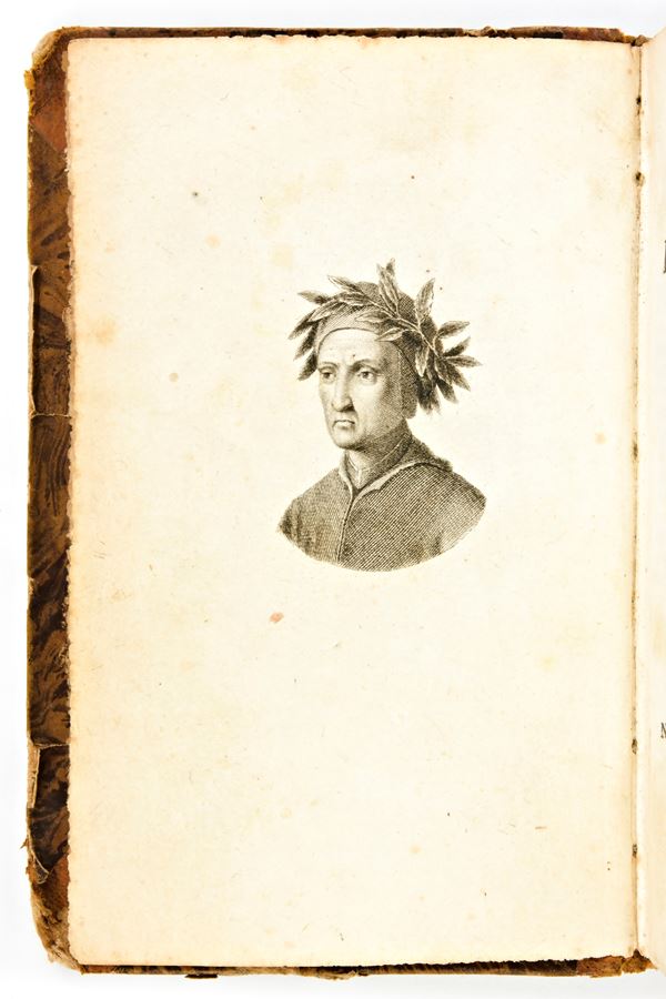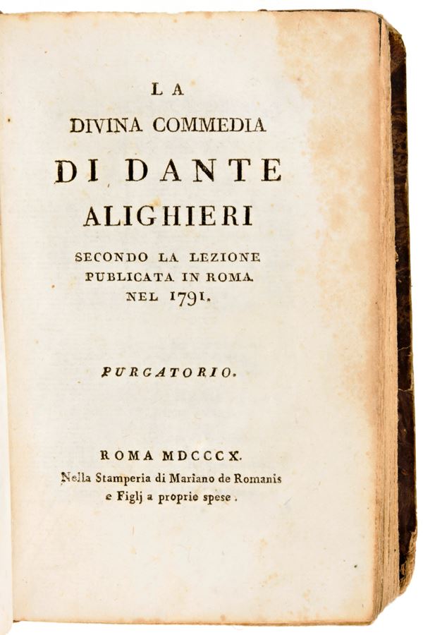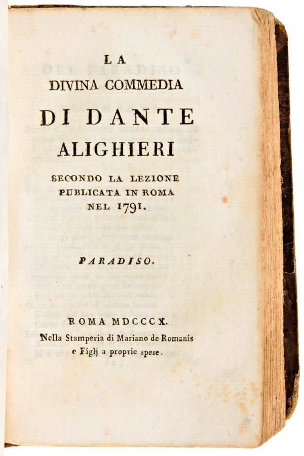 Old edition printed in Rome in 1810 by Mariano De Romanis, 3 frontispieces preserved (Inferno, Purgatory, Paradise). With 1 portrait of Dante Alighieri on the frontispiece. Edition based on the 1791 version by Bonaventura Lombardi. With a biography of Dante by Pierantonio Serassi (1721-1791).