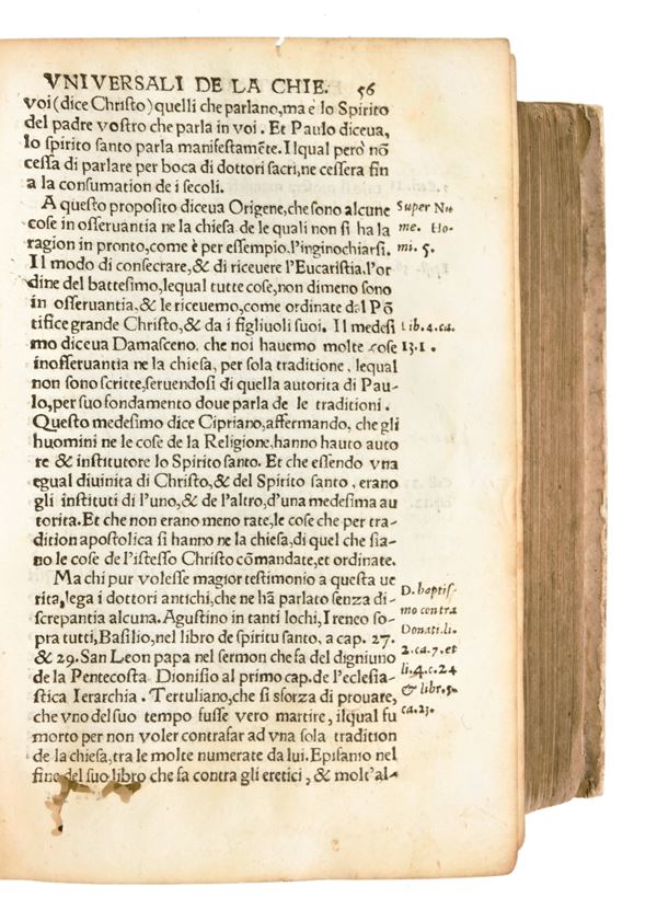 In-8ยฐ, mm. 155x120, cards (4), 652. Complete. Contemporary hardback. Detached back cover. Handwritten titles on the spine (faded). Light water stain on the lower edge affecting about half of the text. Small woodworm damage on the lower margin from f. 18 to f. 100, with loss of text. Woodcut initials. Printed in Venice in 1555 (the first 1553), work by Luigi Lippomano (1496-1559) against Protestant doctrine, deals among other things with the doctrine of the Church: primacy and infallibility of the pope (I), grace, predestination and justification (II), sacraments (III). Original work by Maffeo Albertini (16th century) and Giovanni Del Bene (16th century) revised and expanded by the author. Woodcut typographical device on the title page.