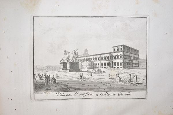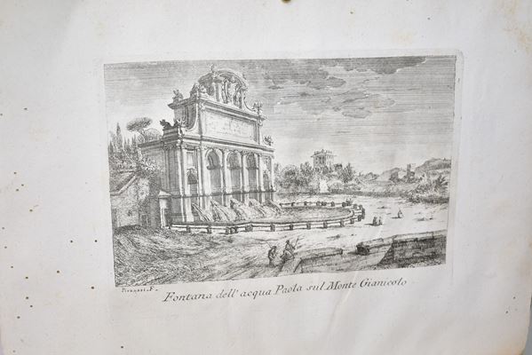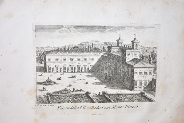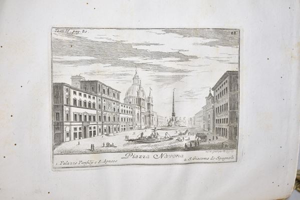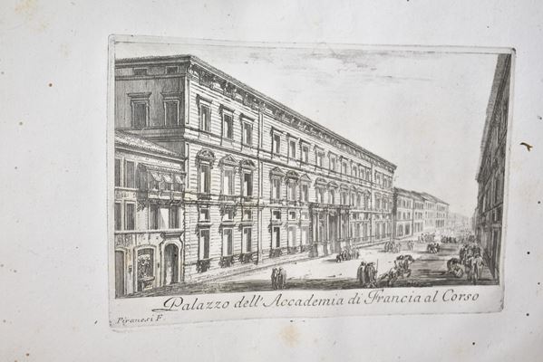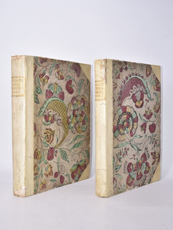 One of the main and most comprehensive works on the topography of ancient Rome, a rare example from the complete edition of the 54 plates of iconographic apparatus, with monuments and views of Rome finely engraved on drawings also made by Giovanni Battista PIRANESI (1720-1778). Includes the plate depicting Villa Borghese. Marginal example, with genuine half-parchment bindings and boards covered in fine paper decorated with flowers and colored by hand; heraldic ex libris of William Charles de Meuron Earl Fitzwilliam on the inside covers; both volumes have small woodworm holes mostly marginal, with slight losses of text limited to the first leaves.