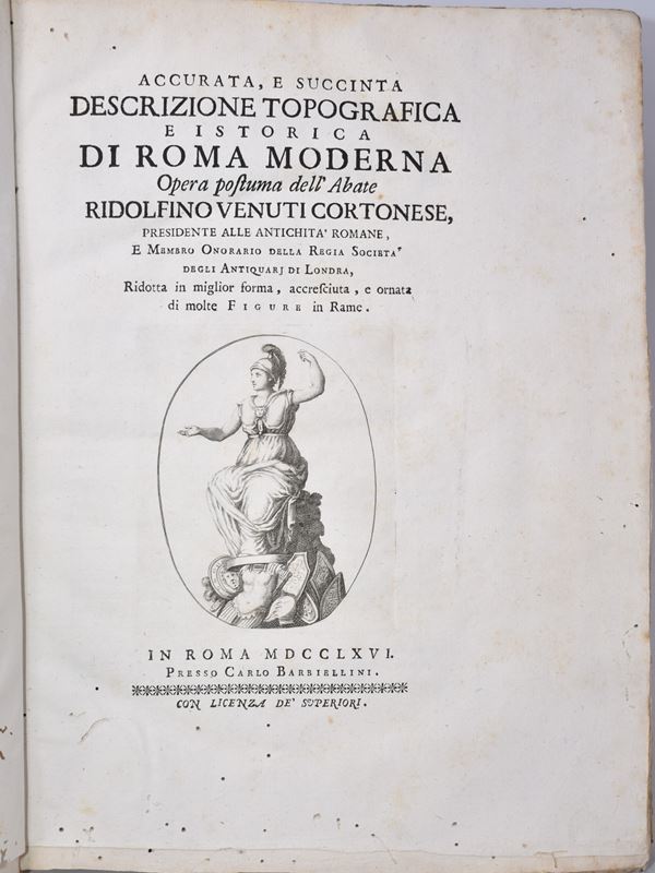 Venuti, Ridolfino ACCURATE AND SUCCINTH TOPOGRAPHICAL AND HISTORICAL DESCRIPTION OF MODERN ROME. POSTHUMOUS WORK OF THE ABBOT RIDOLFINO VENUTI OF CORTONA, ... REDUCED TO A BETTER FORM, ENLARGED, AND ARRANGED WITH MANY COPPER FIGURES. In Rome, 1766, at Carlo Barbiellini.